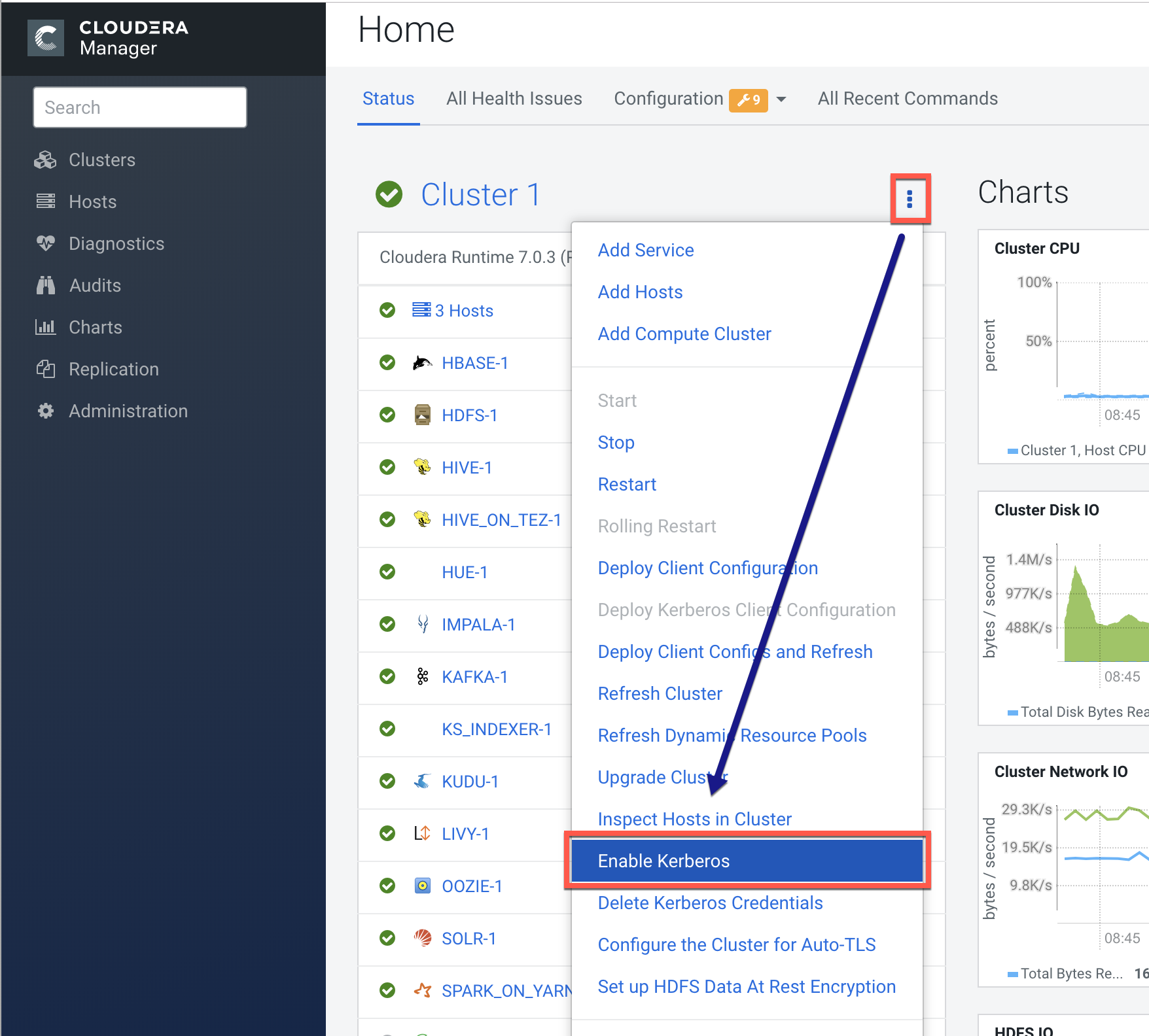 1. To start the Kerberos wizard, open the Cloudera Manager Admin Console, click the options menu for the applicable cluster, then click Enable Kerberos.