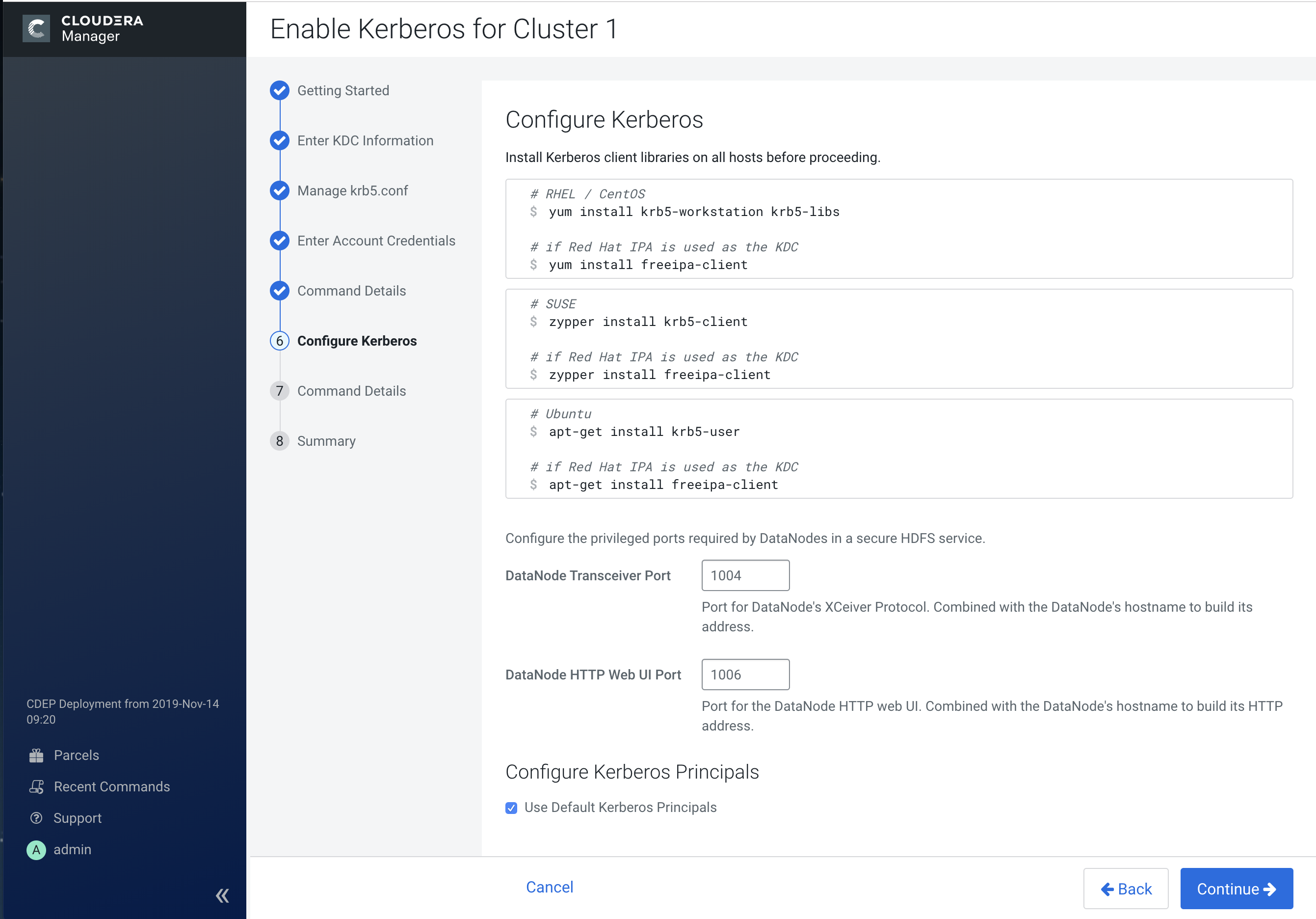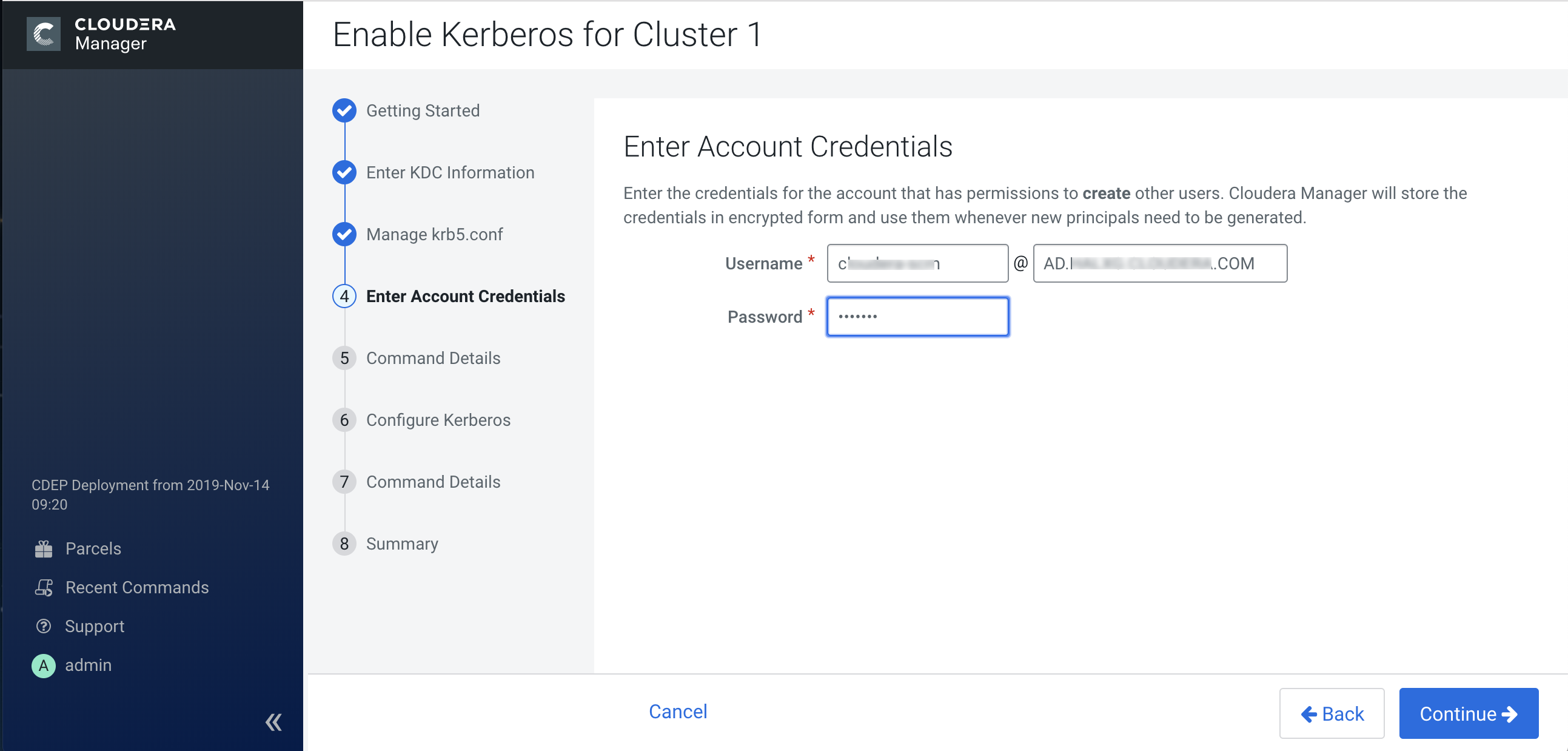 1. Enter the user name and password for the user that can create principals for Cloudera cluster in the KDC. This is the user/principal you created in Step 3: Create the Kerberos Principal for Cloudera Manager Server. Cloudera Manager encrypts the user name and password into a keytab and uses it as needed to create new principals.