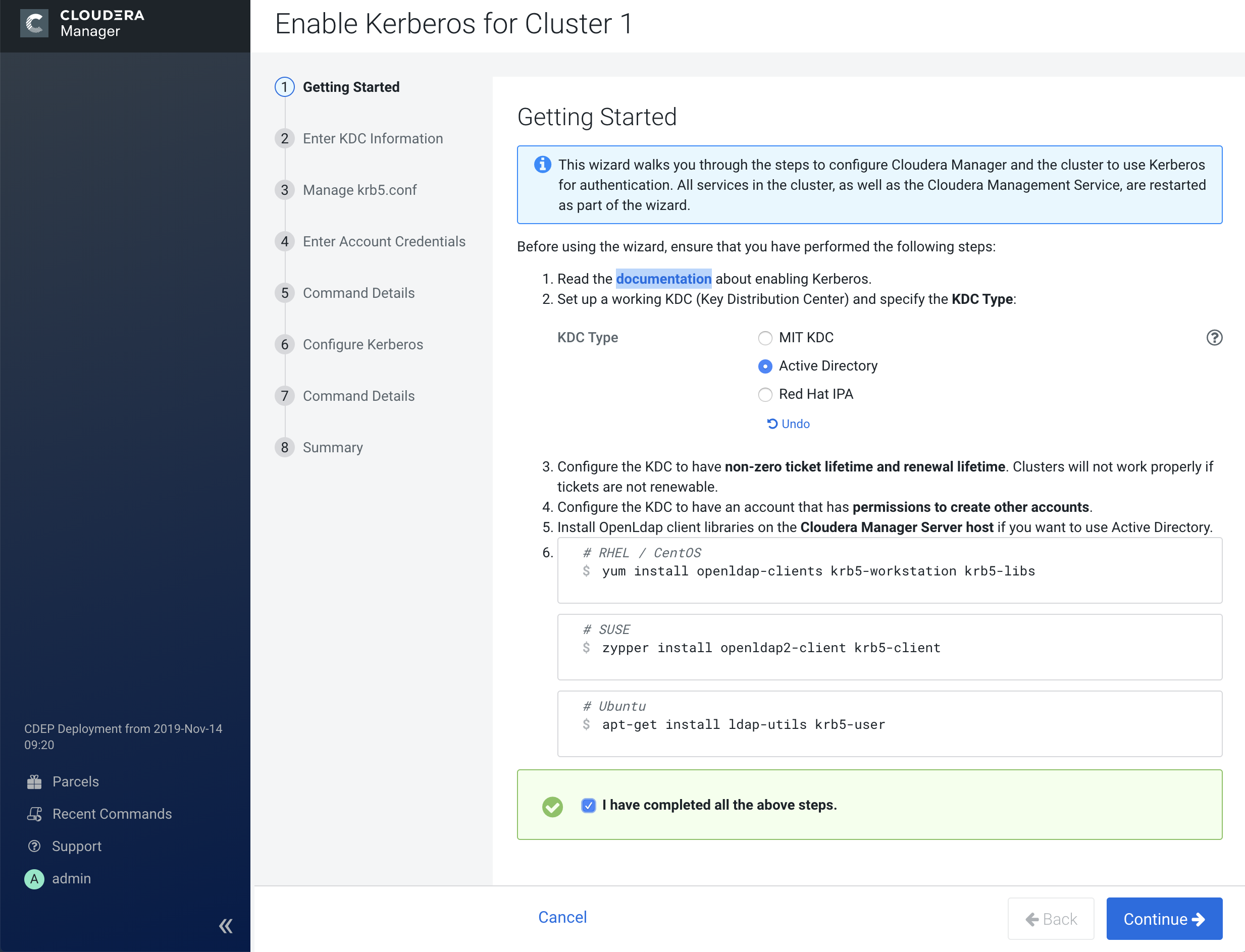 2. After you open the Kerberos wizard, a Getting Started page appears. Select the applicable KDC type to display configuration steps for your specific type of KDC. When you have completed all of the configuration steps, select the I have completed all the above steps check box, then click Continue.