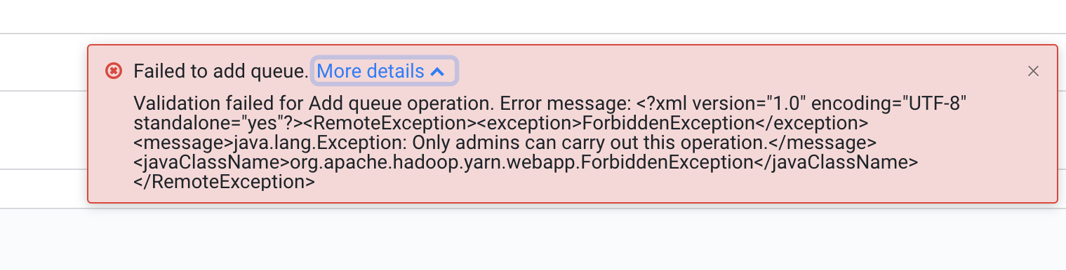 If you get the Exception: Only admins can carry out this operation error message while doing Queue Manager operations, ensure that the principal name is added to the YARN Admin ACL list.