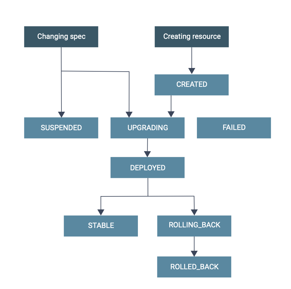 CREATED: The resource is created in Kubernetes, but not yet handled by the Flink OperatorSUSPENDED: The Flink job resource is suspendedUPGRADING: The resource is suspended before upgrading to a new specDEPLOYED: The resource is deployed/submitted to Kubernetes, but not yet considered to be stable and might be rolled back in the futureSTABLE: The resource deployment is considered to be stable and will not be rolled backROLLING_BACK: The resource is being rolled back to the last stable specROLLED_BACK: The resource is deployed with the last stable specFAILED: The job terminally failed