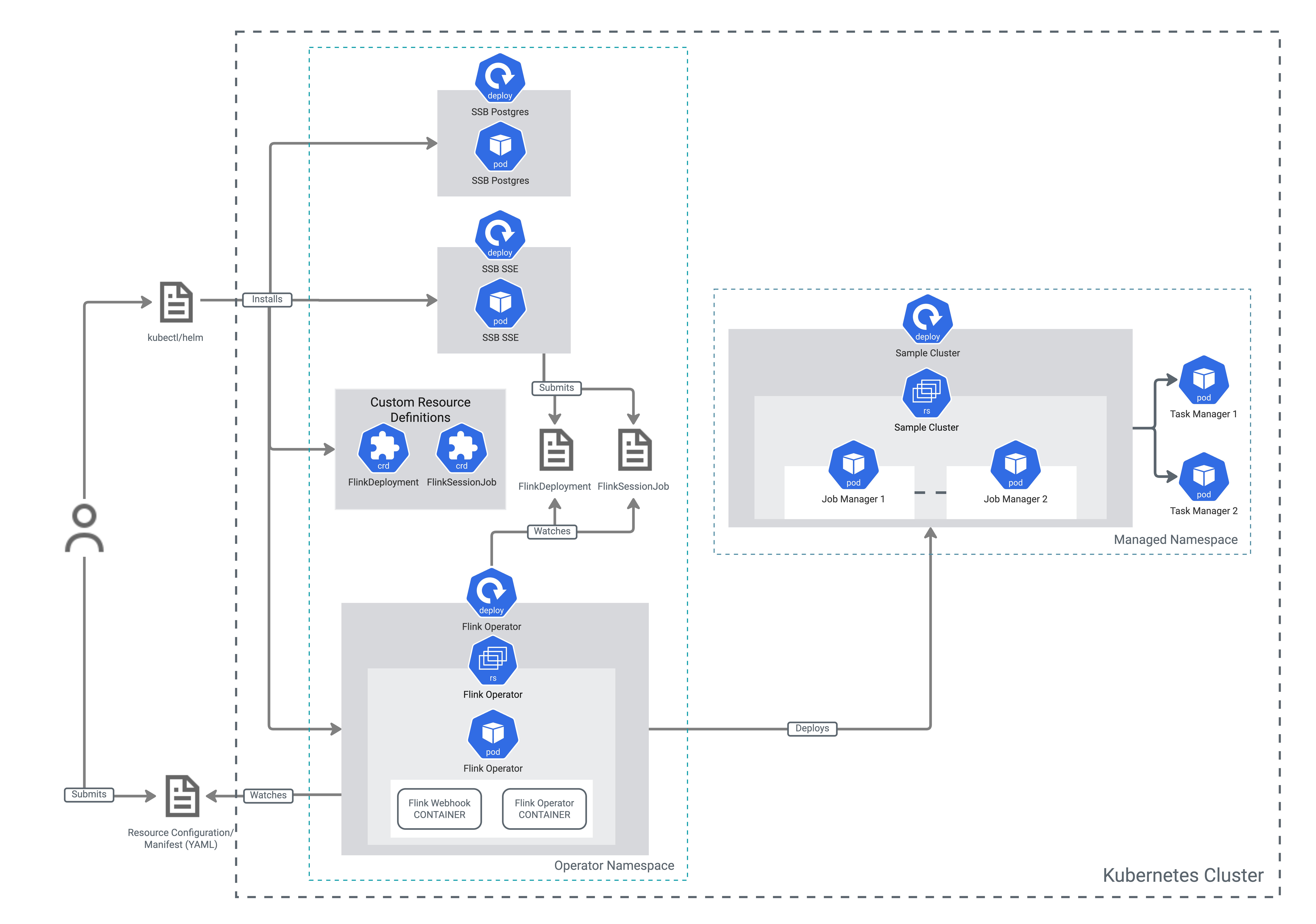 Cloudera Streaming Analytics Operator for Kubernetes can be installed on a Kubernetes cluster using Helm. The installation of Cloudera Streaming Analytics Operator for Kubernetes creates the deployment of the Apache Flink Kubernetes Operator (Flink Operator), Flink Webhook, and registers the Custom Resource Definitions (CRDs) on the Kubernetes cluster. As an extension, built on top of the Flink Operator, Cloudera Streaming Analytics Operator for Kubernetes also deploys the Cloudera SQL Stream Builder engine and its corresponding PostgreSQL database.