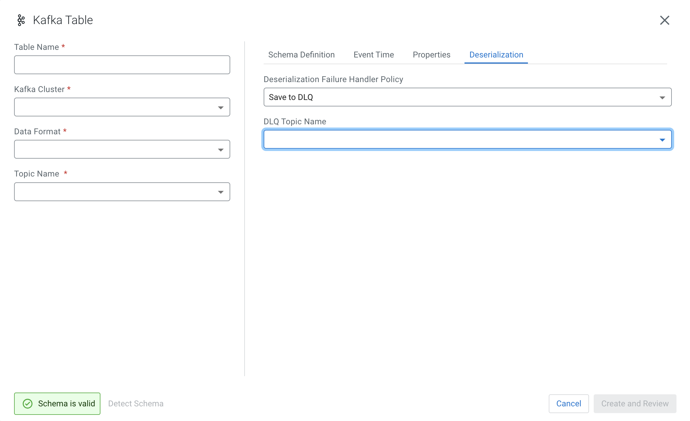 When creating a Kafka table, you can configure how to handle errors due to schema mismatch using DDL or the Kafka wizard.