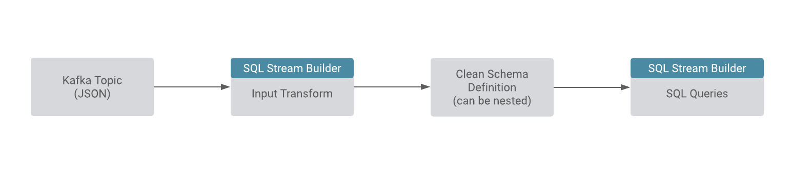 Input Transforms are a powerful way to clean, modify, and arrange data that is poorly organized, has changing format, and has data that is not needed or otherwise hard to use. With the Input Transform feature of SQL Stream Builder, you can create a javascript function to transform the data after it has been consumed from a Kafk topic, and before you run SQL queries on the data.
