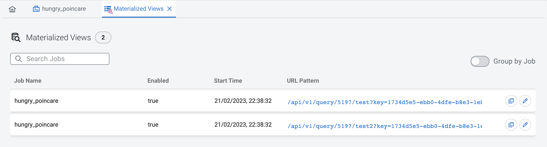 After executing a SQL Stream job, you can set up the Materialized Views to have a snapshot of your queried data. You can use the URL Pattern from the Materialized View to visualize the generated data.