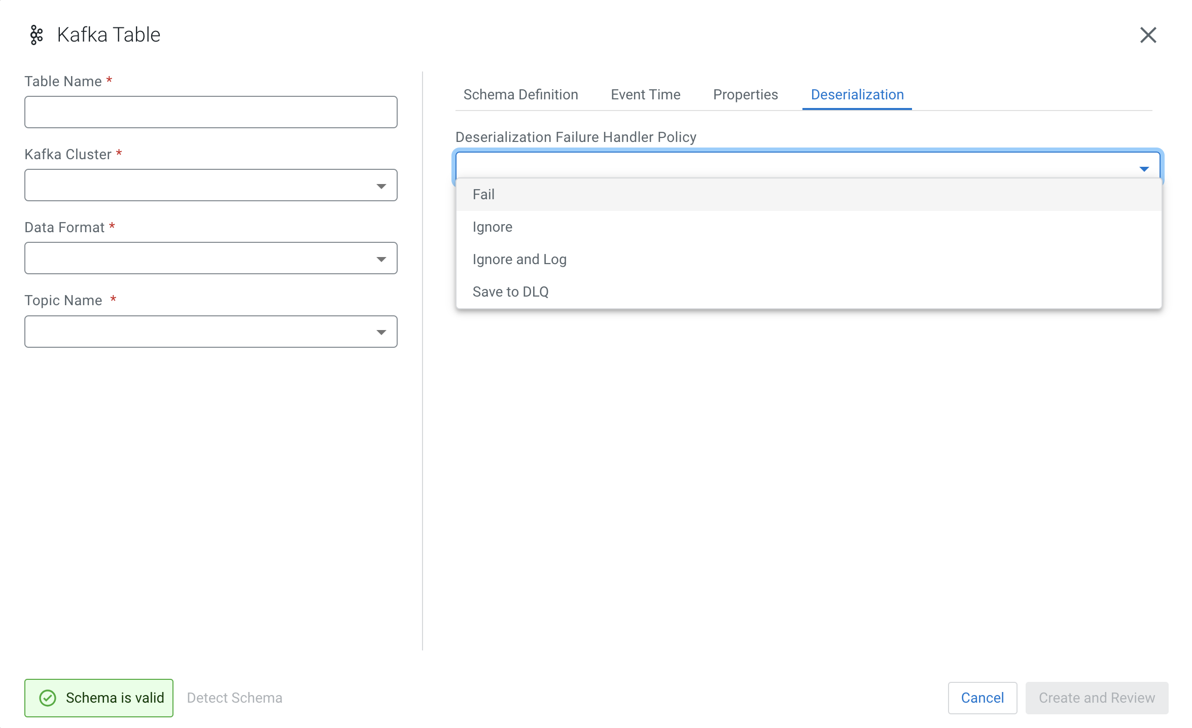 When creating a Kafka table, you can configure how to handle errors due to schema mismatch using DDL or the Kafka wizard.