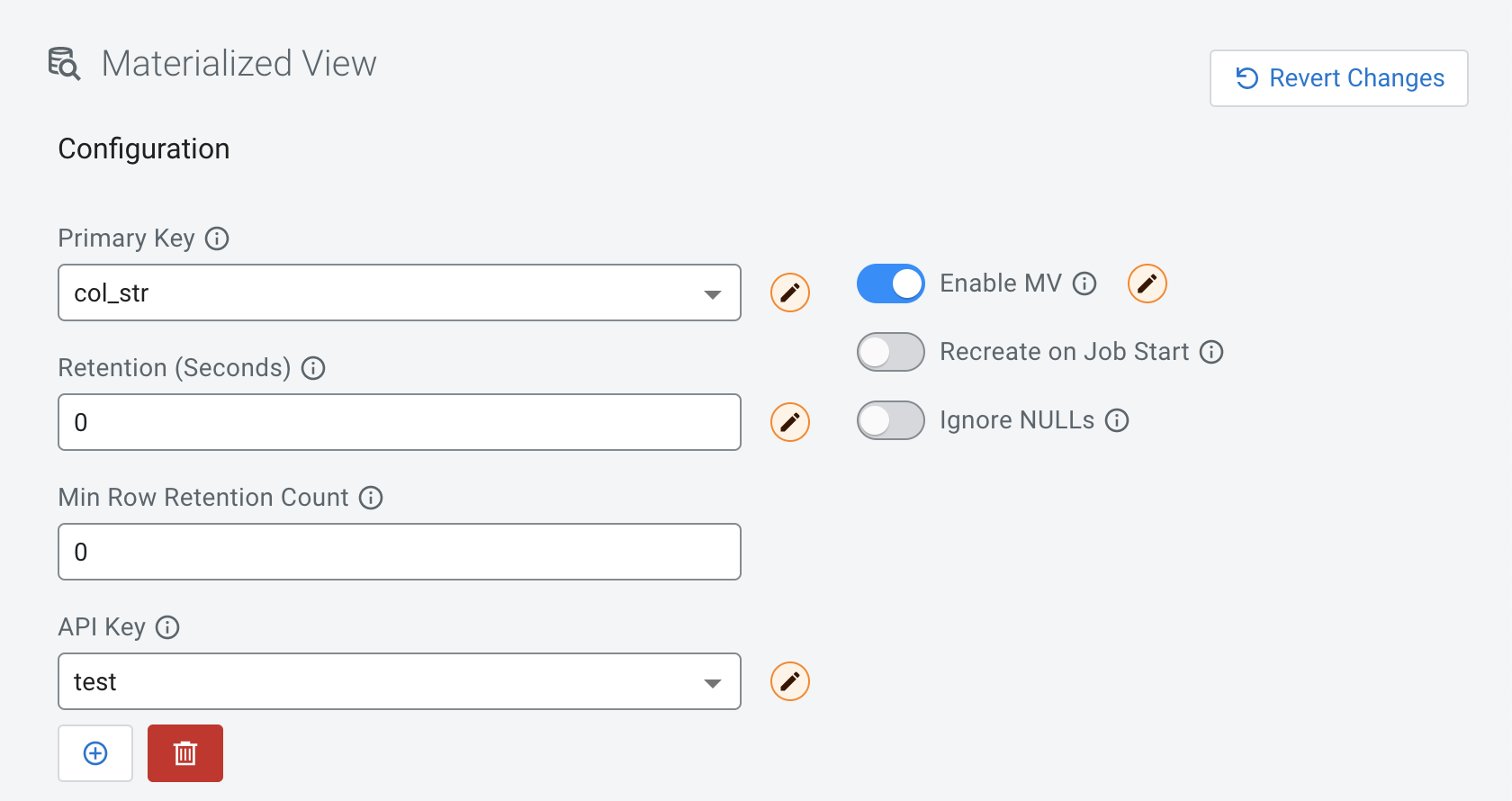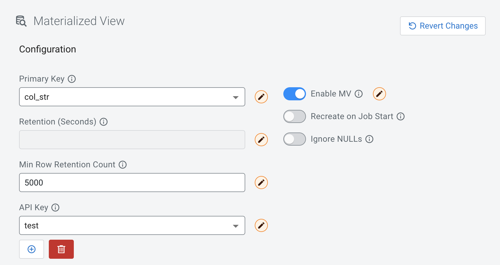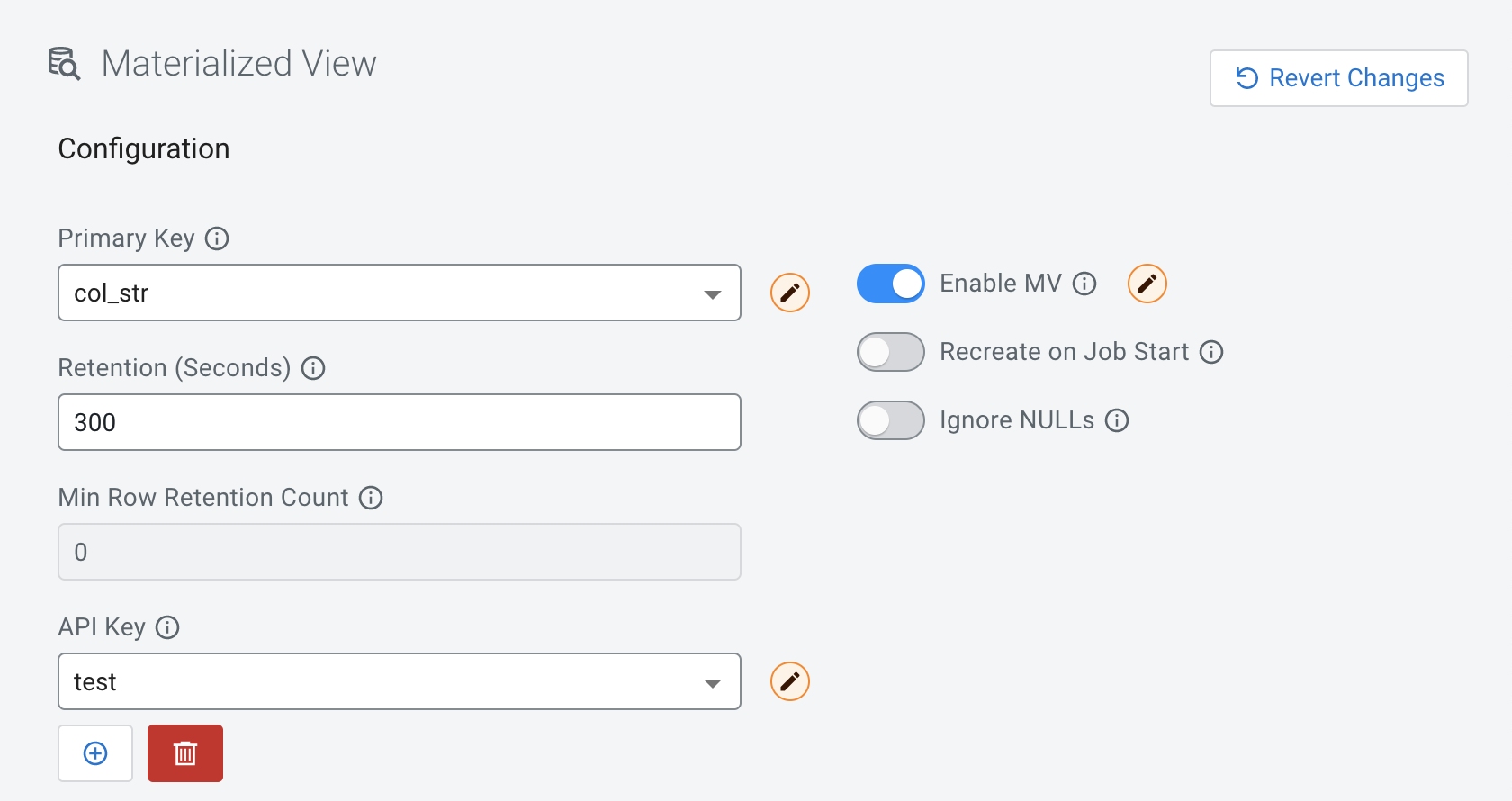 When creating Materialized Views, you can configure how the system should retain the data rows in the Materialized Views. You can either choose between retaining the data by time or the row count.