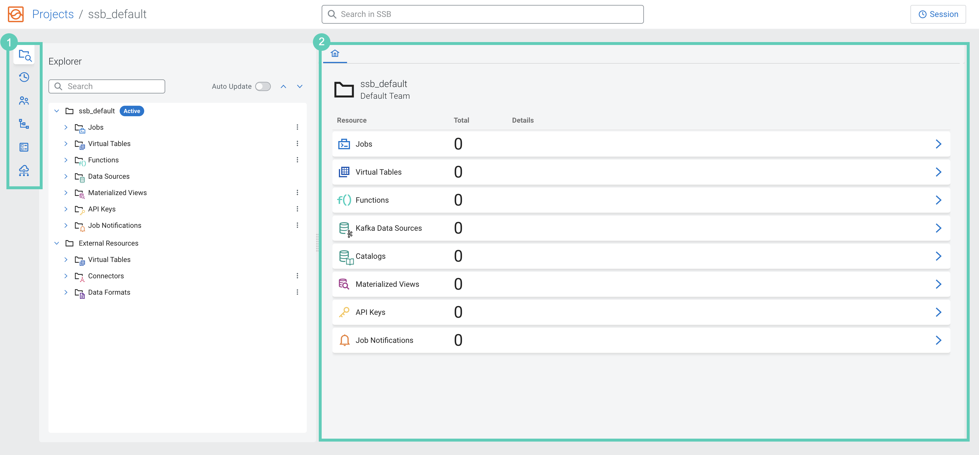 When you open a project in Streaming SQL Console, you can navigate between the Project Manager and the Tab view of the Project Resources.