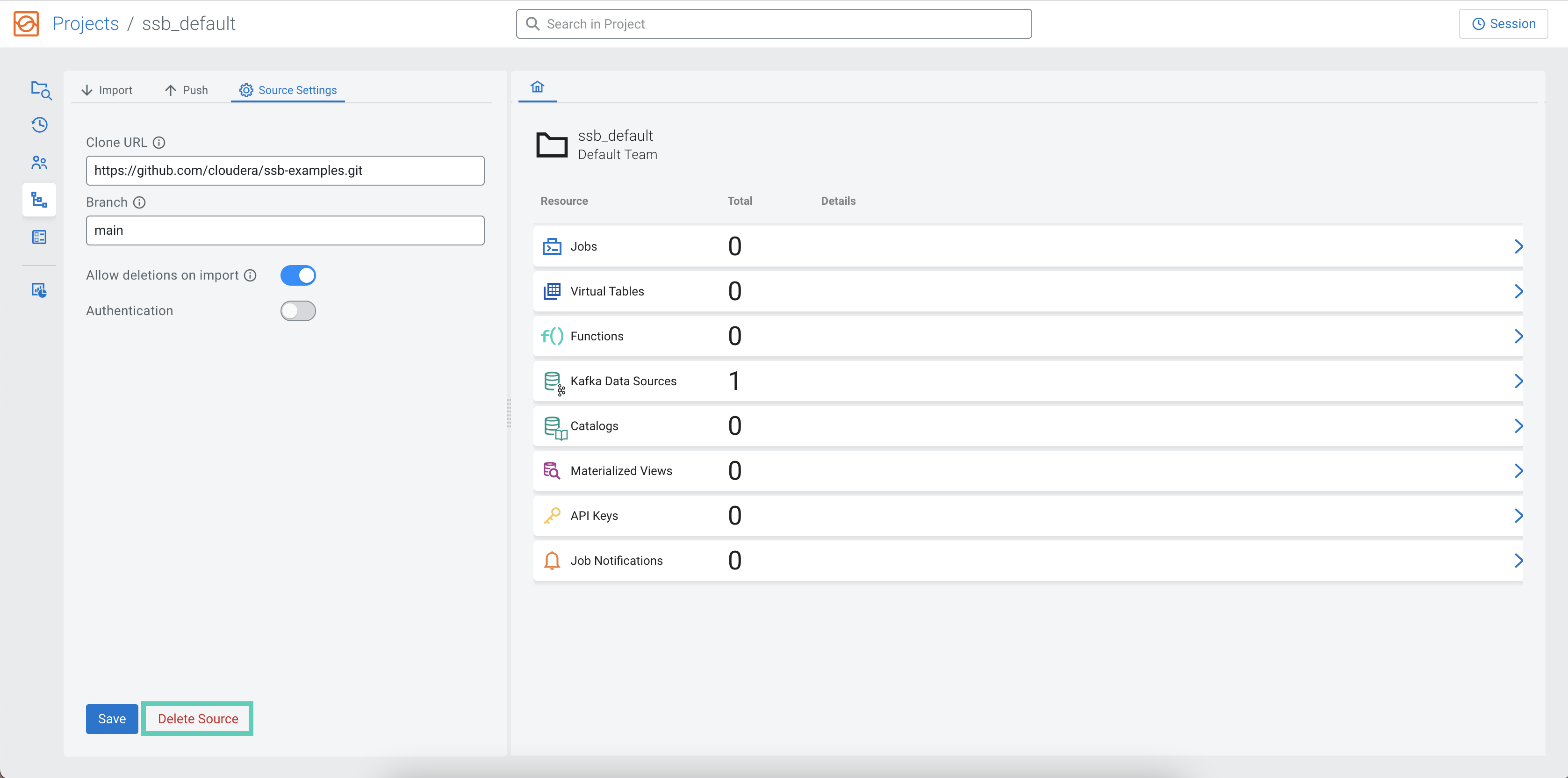 - You can manage the source information of a project under the Source Settings tab. You can change the Clone URL and Branch information of the Git repository. You can enable Allow deletions for importing a project, and configure the Authentication method that is used when interacting with the repository.