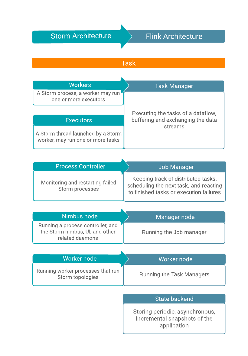 The basic architecture of task execution is similar in Storm and Flink. The main difference between the two systems is that Workers and Executors are responsible for executing the tasks in Storm, while in Flink the execution is done by only the Task Managers. The Task Managers also manage the state backend, which is a durable storage for storing states.