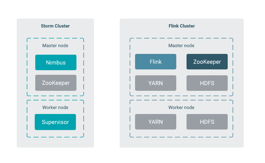 Flink has a simpler architecture compared to Storm as the Task Managers fulfill the jobs of Workers and Executors. The process of task execution is similar: a Process Controller/Job Manager on a master node starts a worker node. On a worker node the Workers and Executors in Storm, Task Managers in Flink are responsible for running the Tasks. As the Executor, the Task Manager can also run more than one tasks at the same time. The resource management for the tasks are completed by the Process Controller in Storm and by the Job manager in Flink.
