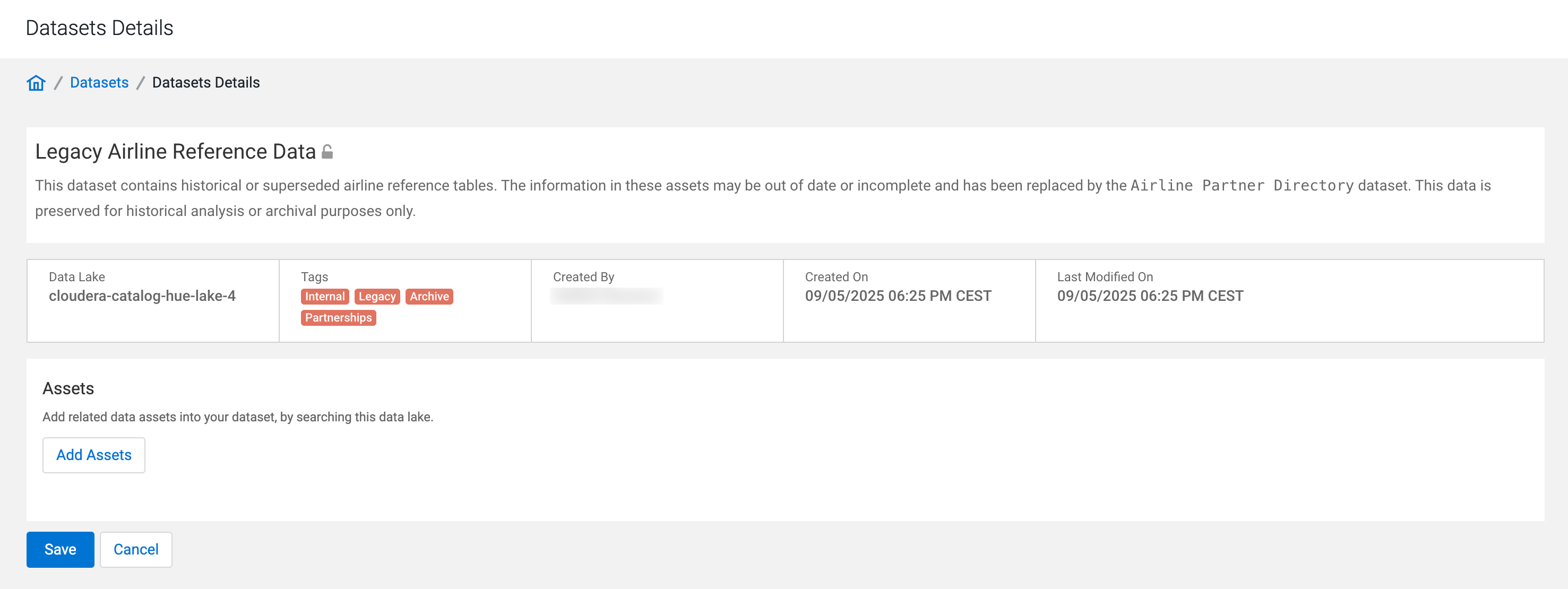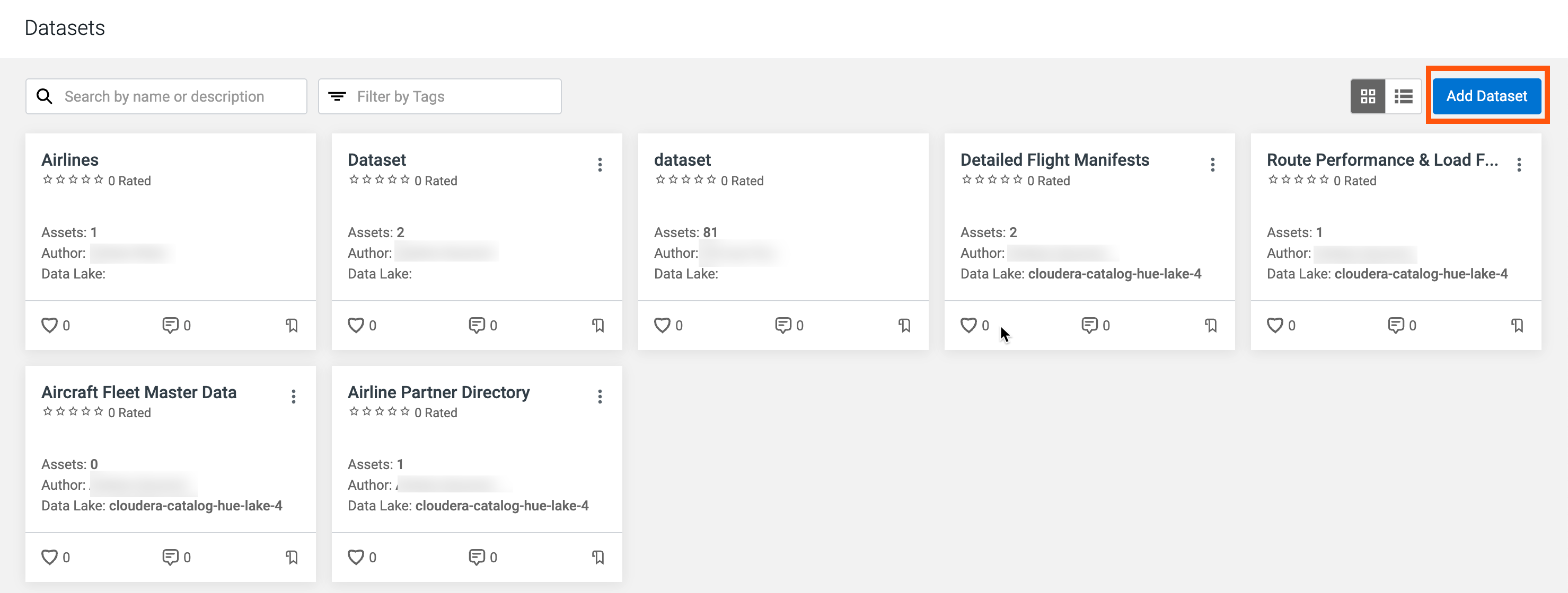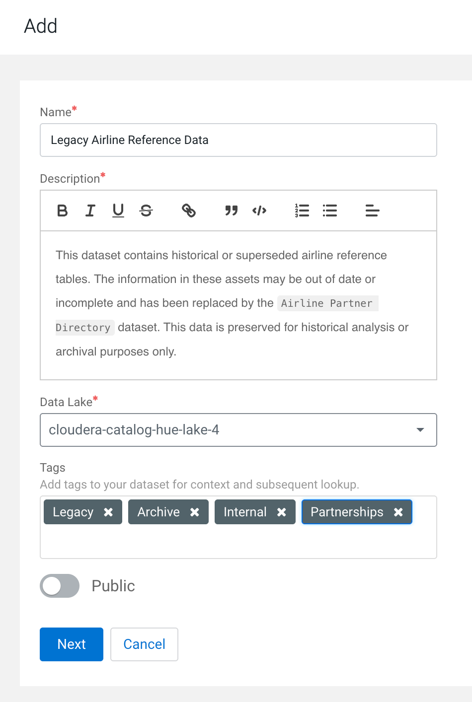 Field Name Description Example Values Name Enter an appropriate dataset name. This name cannot be duplicated across the system. (Mandatory) Customer Profiles, Sales Assets, Financials Description Describe the purpose or intent of the dataset. (Mandatory) Contains customer profiles: data assets for US and WW. Data Lake Assign the dataset to a data lake. Choose from a list of available data lakes. (Mandatory) dss_bbsh_clust3 Tags Add tags to your dataset for context and subsequent lookup. Tags enable you to quickly catalog, search and retrieve asset collections in Cloudera Data Catalog, as well as, share such information with others in the future. (Optional)1 se, pii, geo, finance Public/Private Select Public if you want other users to have access to this dataset. Select Private if only you want to have access to this dataset. Public/Private