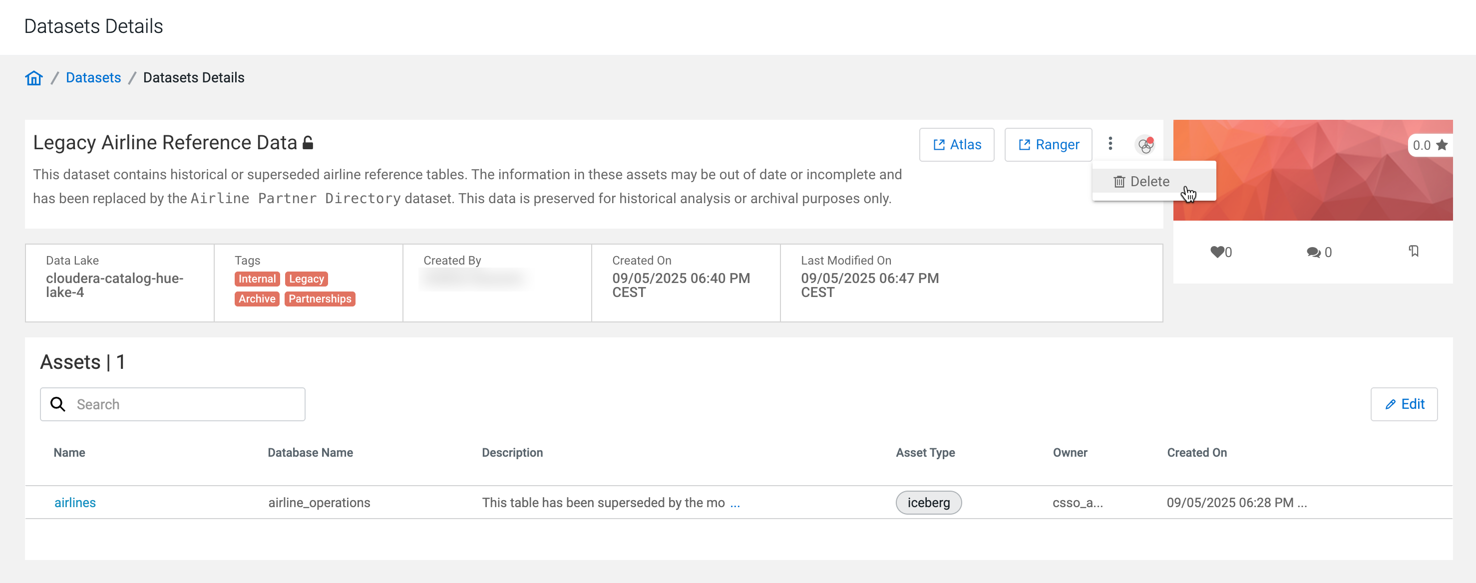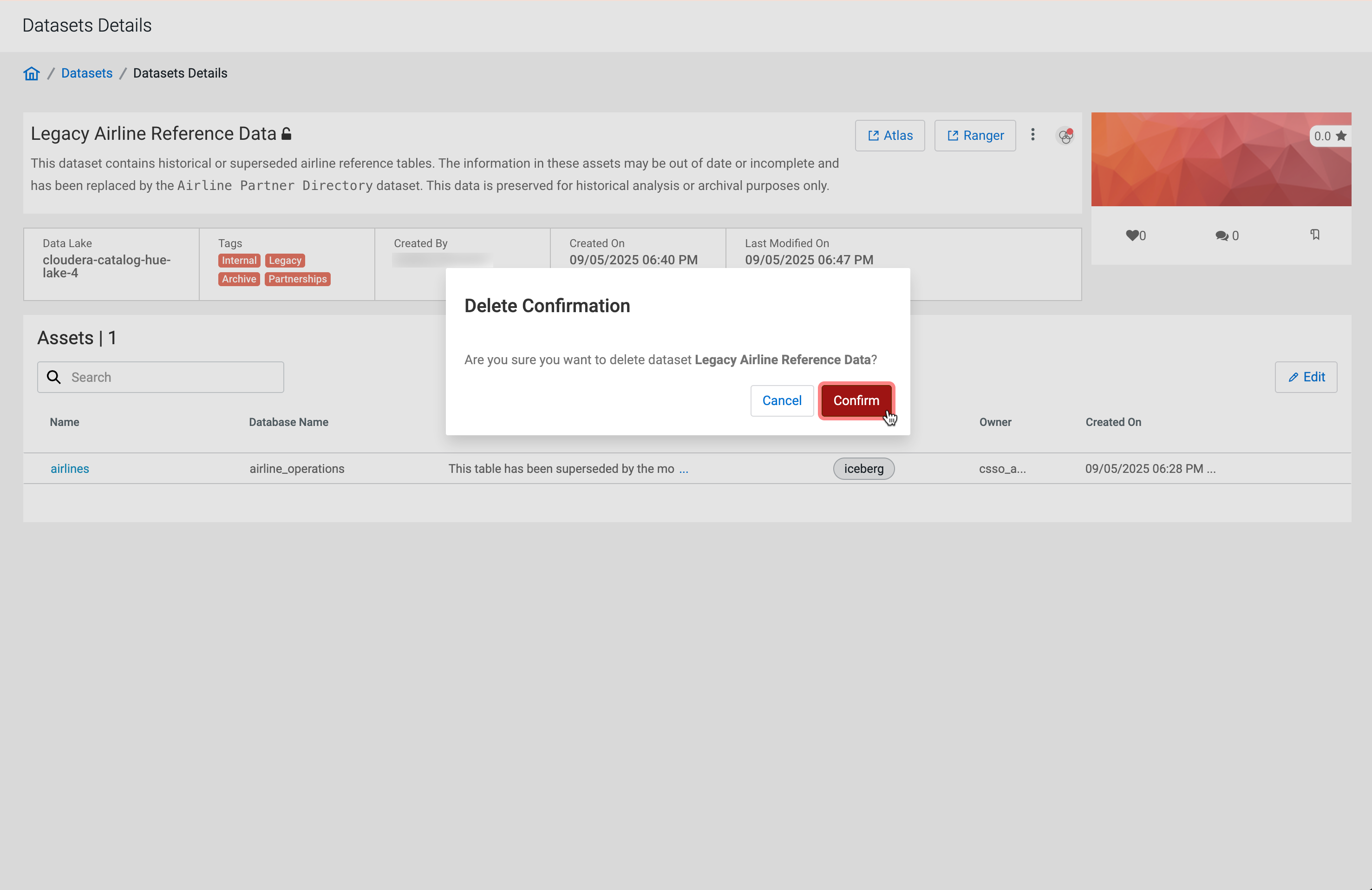 You might want to delete a datasets if you no longer need to track those datasets, or if you want to reassign those assets to another dataset. You can delete datasets at any time. Deleting datasets does not delete the assets contained therein, it only disassembles the datasets. You can recreate datasets or reassign assets to new datasets.