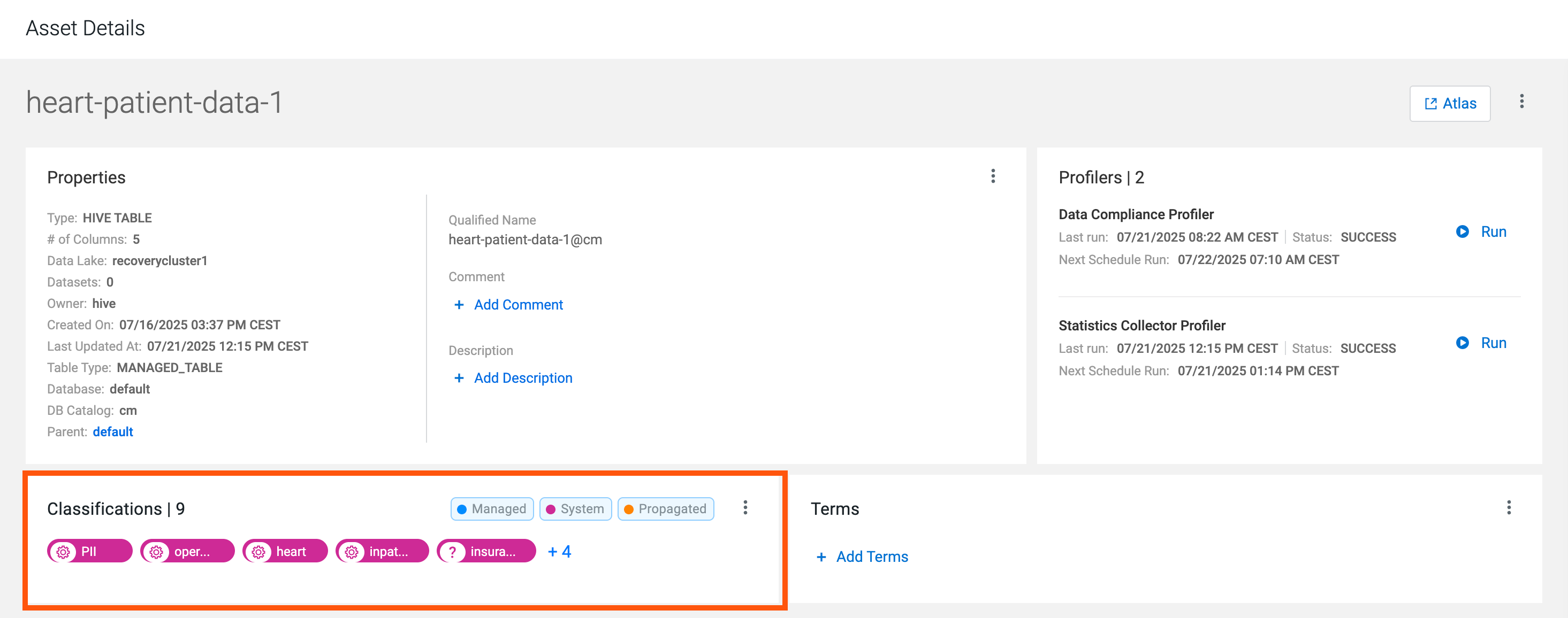 Once your Data Compliance Profiler job completes, you can check your profiled assets one-by-one and decide to keep the suggested tags or remove them from asset before they are synchronized to Apache Atlas.
