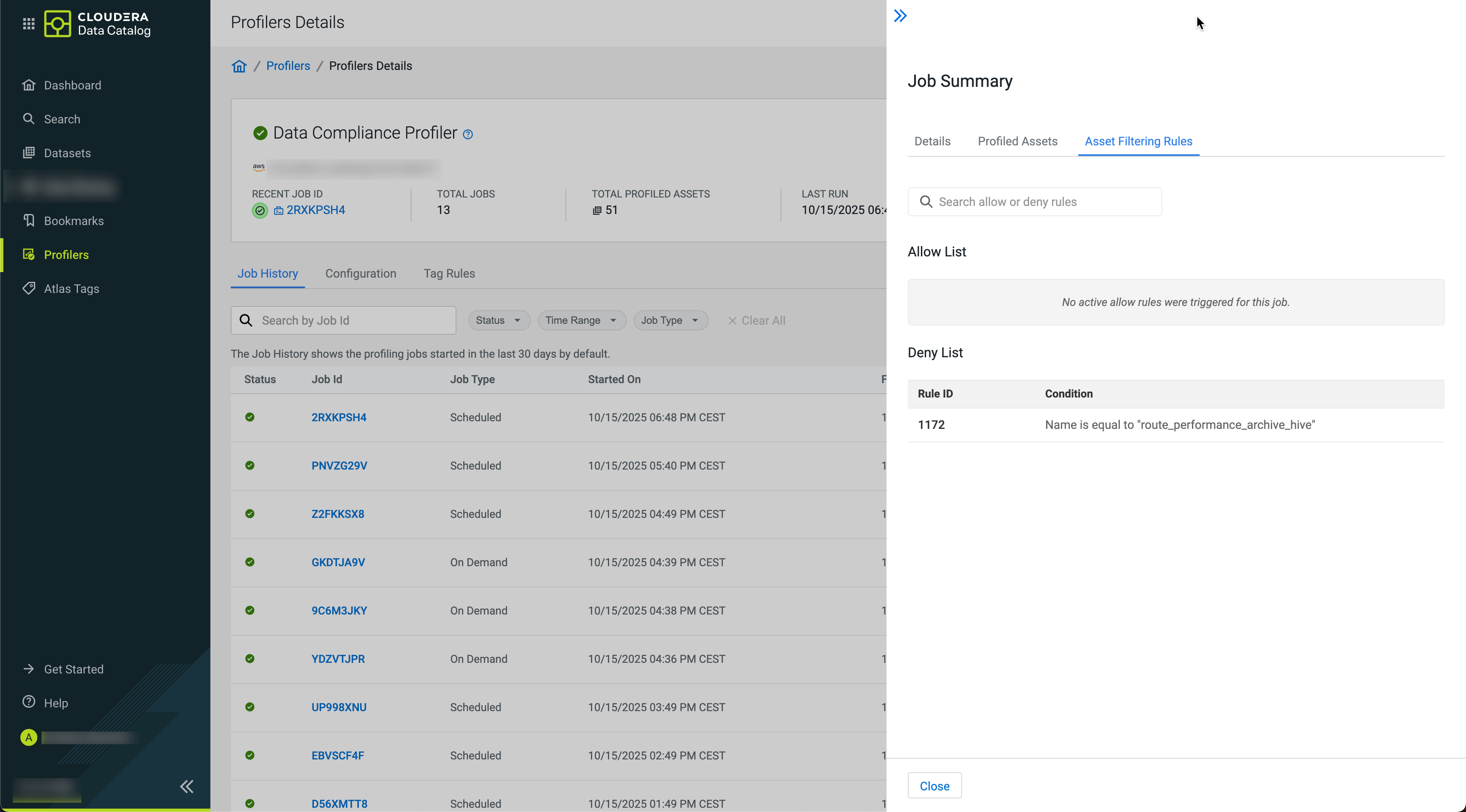 The Asset Filtering Rules tab summarizes the active filtering rules for your profiling job.