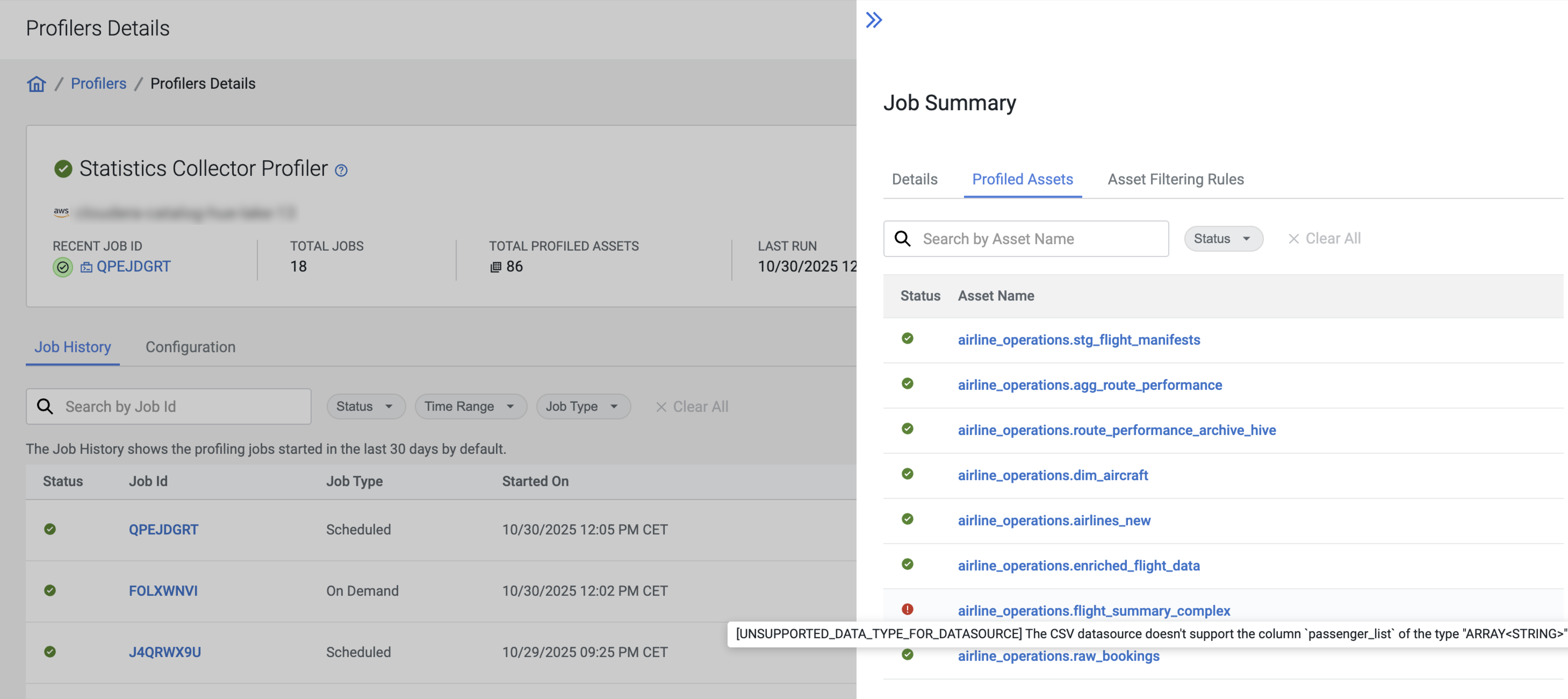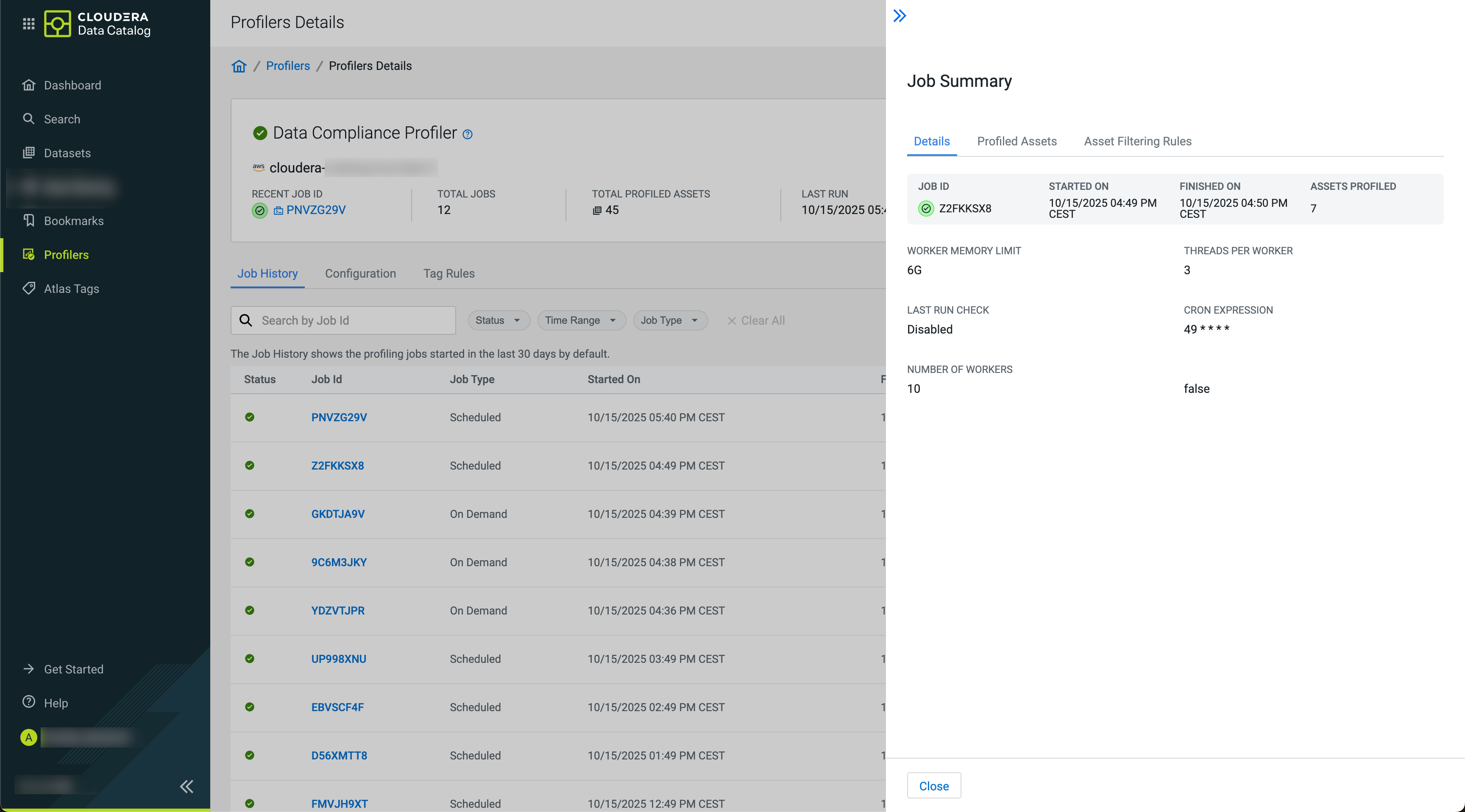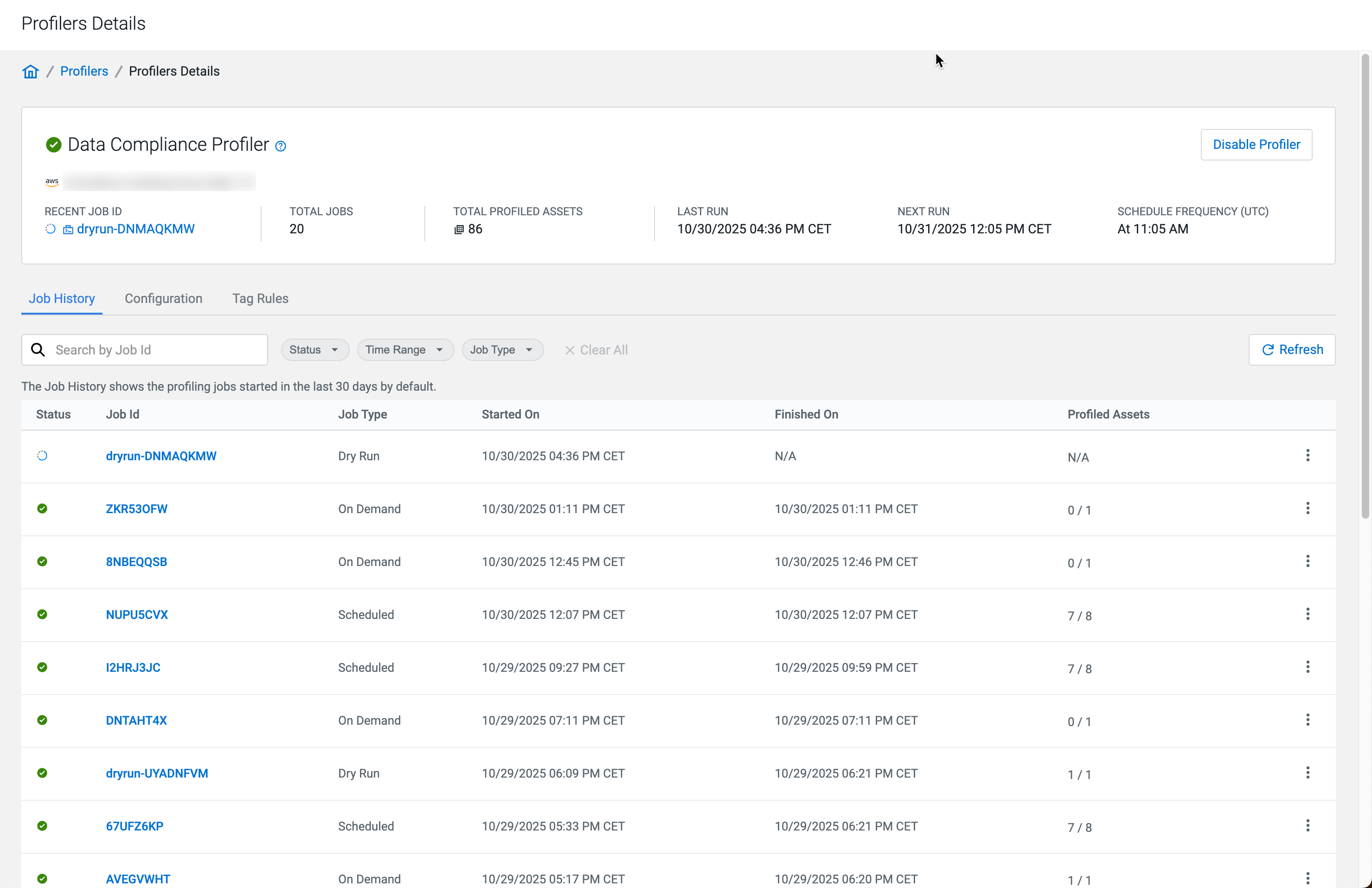 Track and monitor profiler jobs using the Profilers > Jobs page to view job statuses, execution details, and troubleshoot issues. Access key information such as profiler type, job status, and profiling history to manage and analyze your assets effectively.