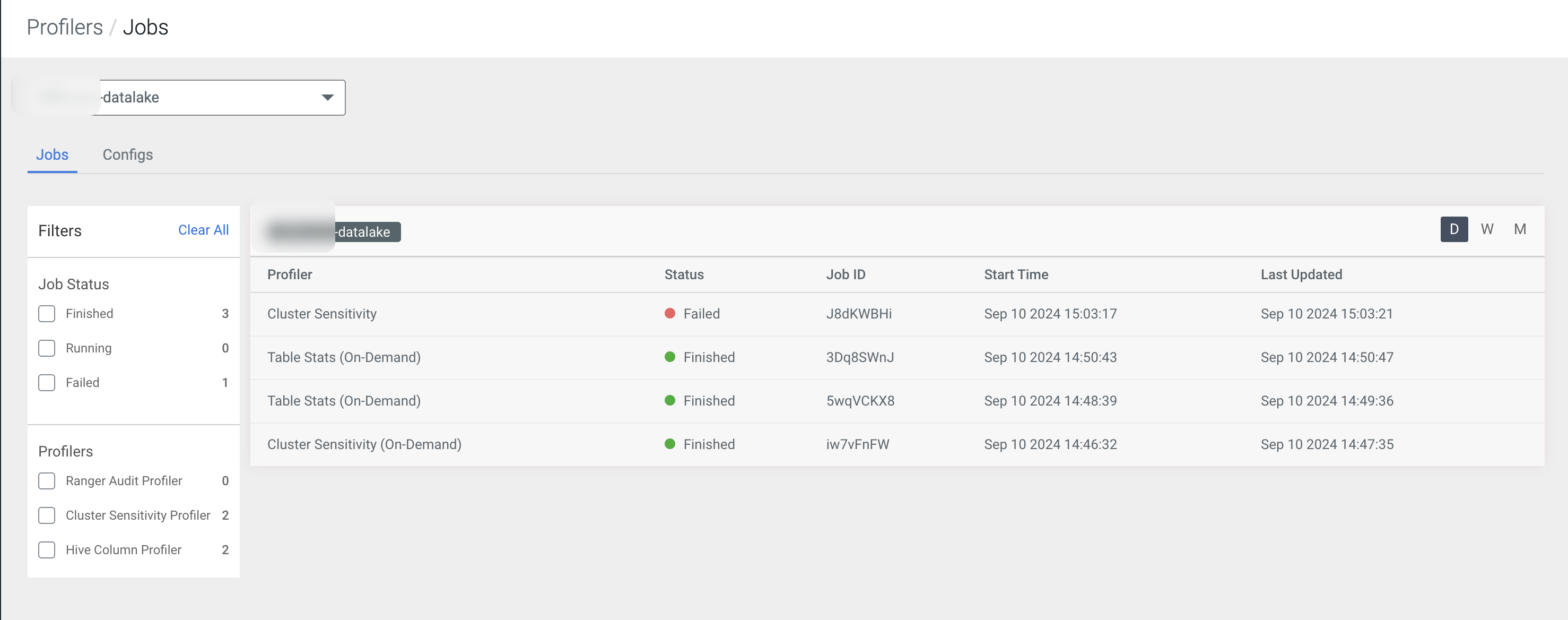Under , you can have an overview of your started profiler jobs. By using the D, W, M filters, you can go back up to a day, week or a month, to see your previous jobs. Use this page to quickly check if your profiler jobs are failing.