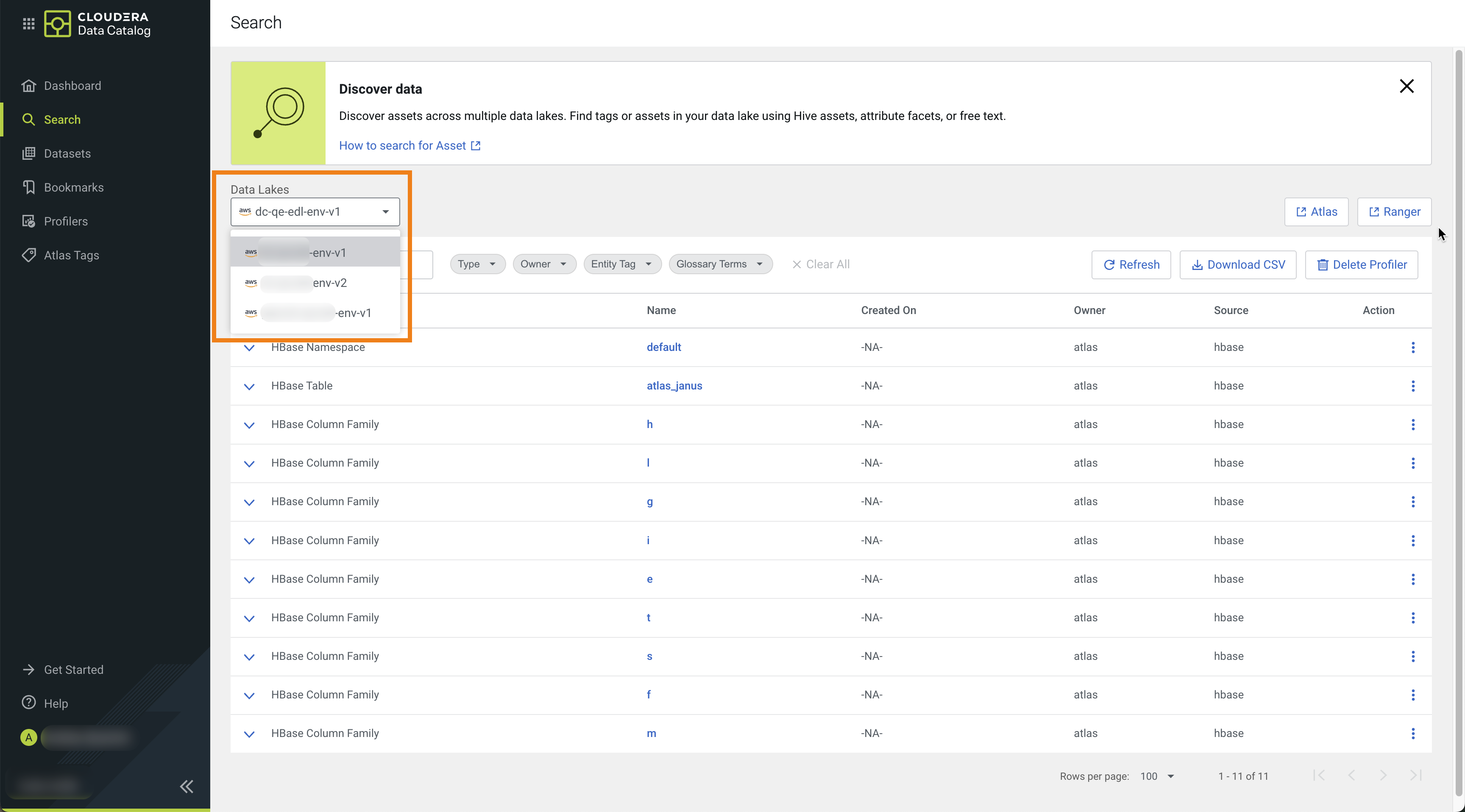 On the Cloudera Data Catalog Search page, select a data lake and enter a search string in the search box to view all the assets with details that contain the search string.