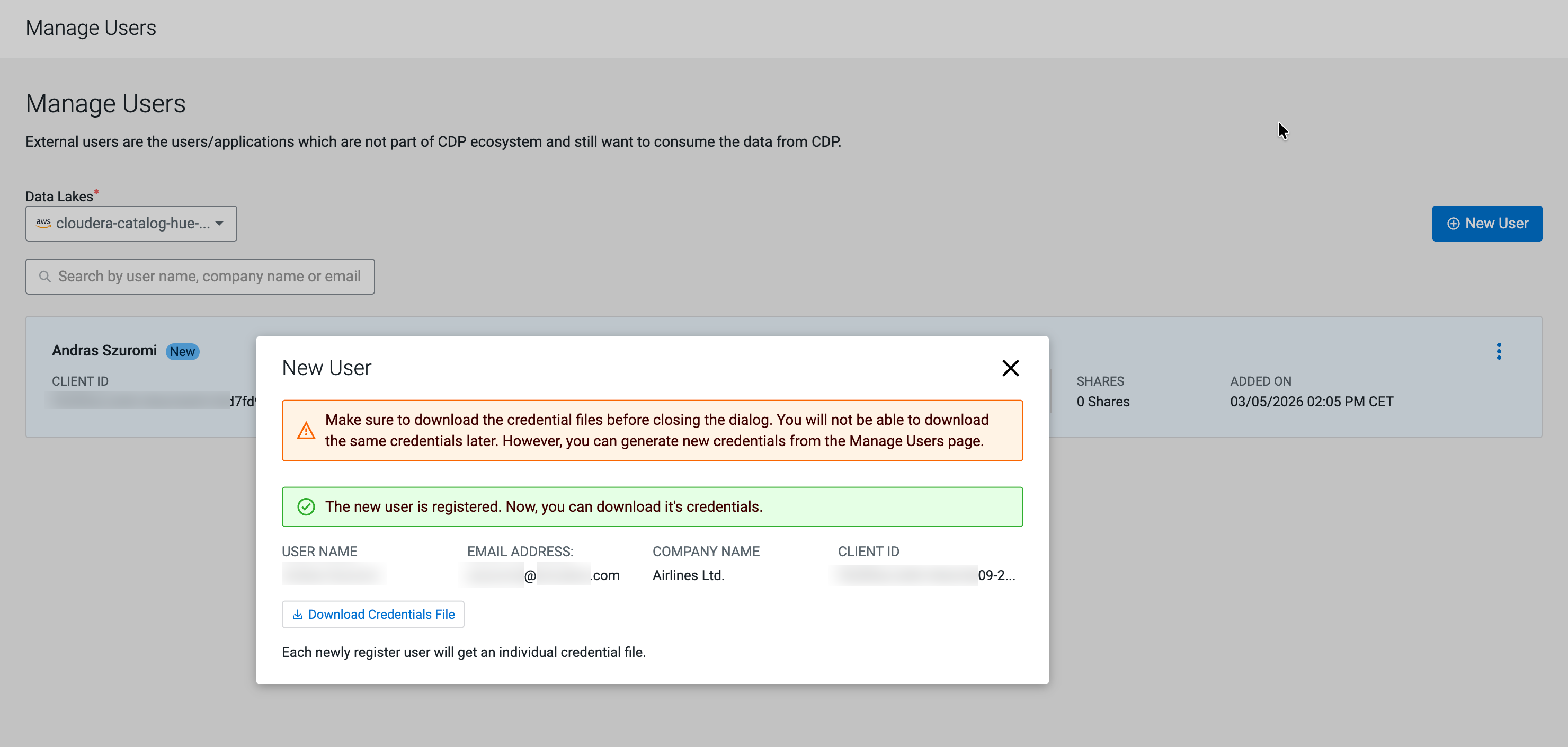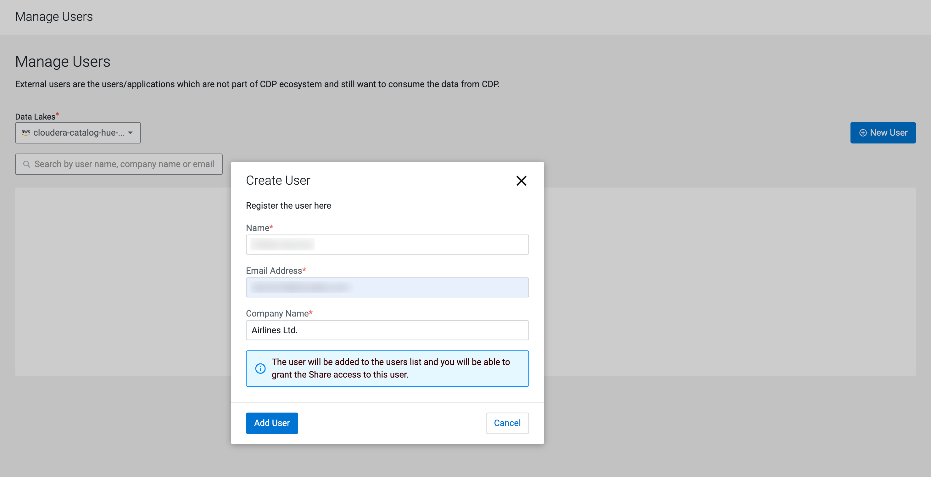 External users are users or applications that are not part of the Cloudera ecosystem but need to consume data from Cloudera through Data Shares. Before a user can be added