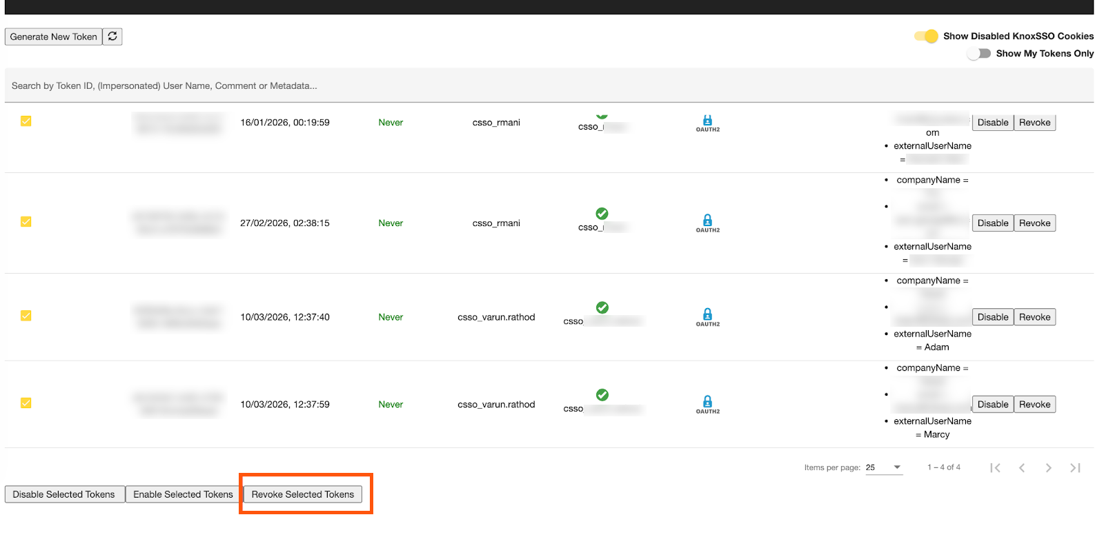 To resolve the issue where old credentials are still working and external users are still attached to old Data Shares in Ranger, you can invalidate the old credentials directly within the Knox user interface, and remove the users from Ranger.