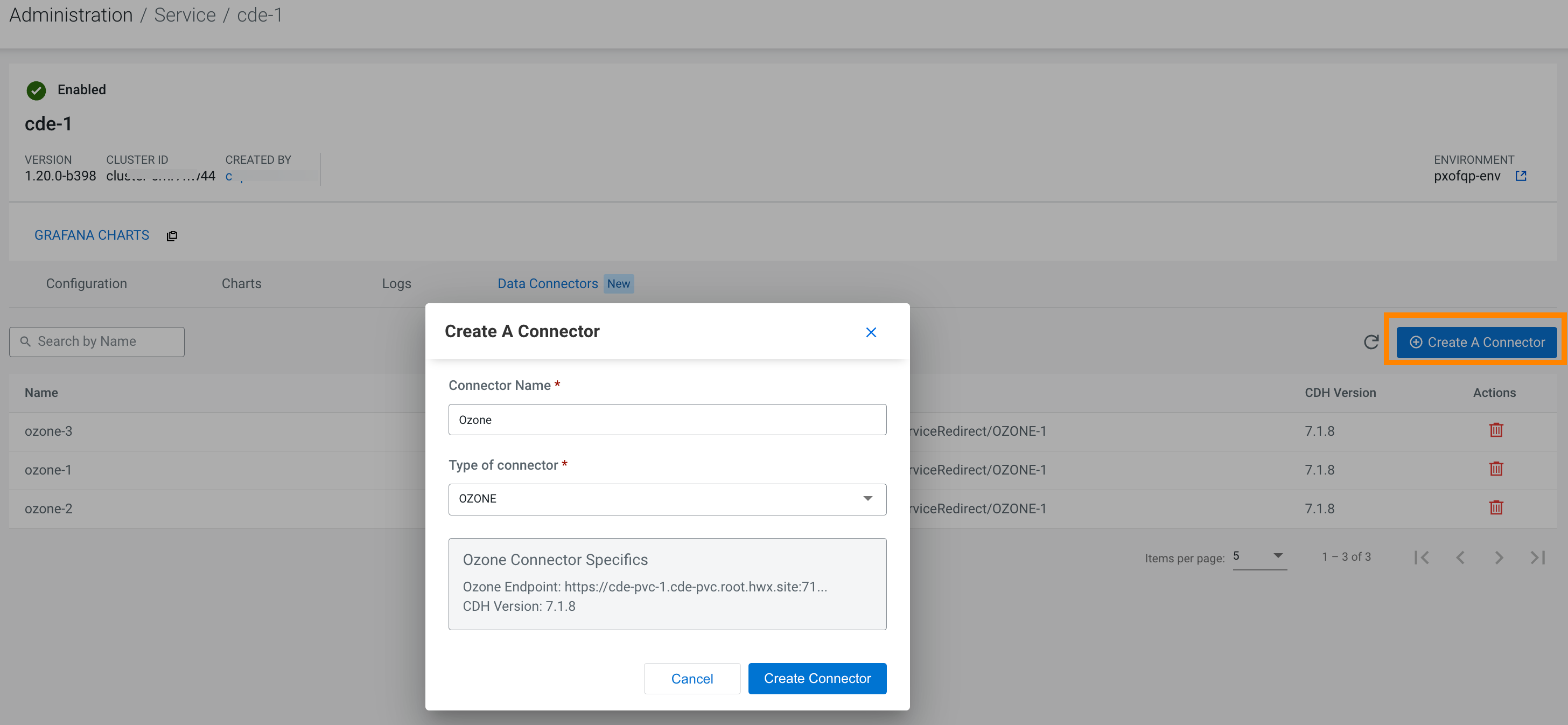 - Click the Data Connectors tab. On the Data Connectors tab, you can view details about the existing data connectors, if any, including the Cloudera Data Engineering service name, URL for the storage, CDH Version, and the Cloudera environment.