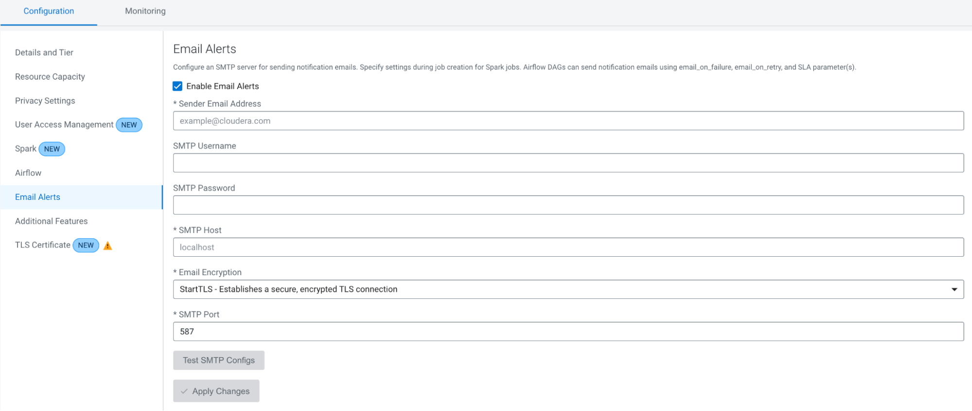 - Click Test SMTP Configs to test the configurations set for SMTP. This allows you to test the SMTP configuration before creating the cluster.