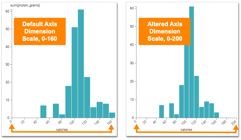 The image on the left shows the minimum and maximum scale of the X axis from 50 to 160. You can see that that in the right image, the scale changes when you change the values from 0 to 200. Increasing the scale also gives a clearer visual representation of where the calorie levels fall within a range of values.