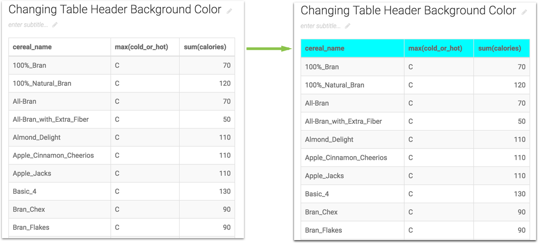 In the following example, notice the difference in the tables before and after changing the background color of the header.