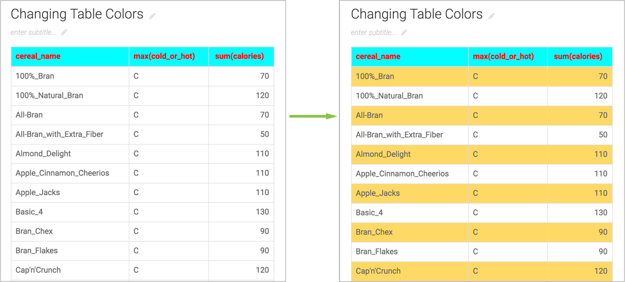 In the following example, notice the difference in the table rows before and after changing the background color of the odd rows.