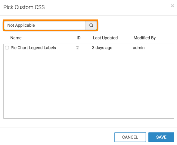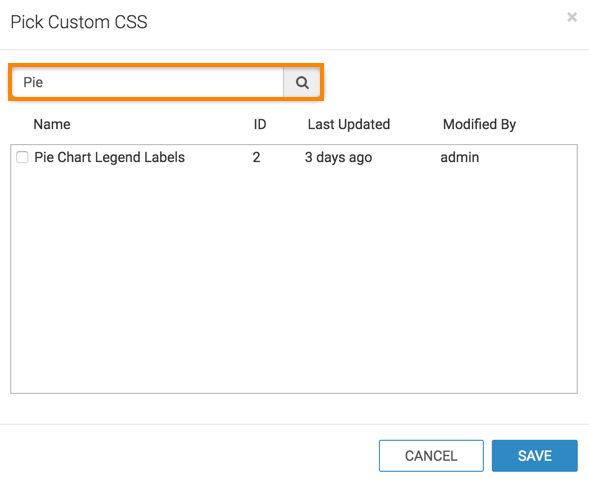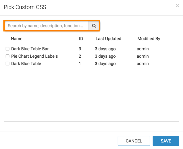 Cloudera Data Visualization enables you to search custom styles in visuals by Name and Modified By fields. You can also search by the content of CSS and Javascript code.