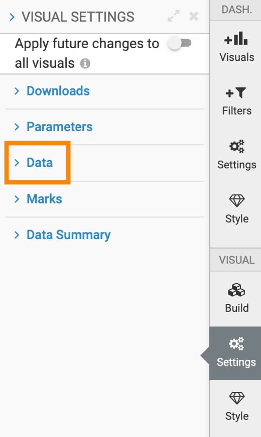 Customizing data for visuals Follow these steps to get to the data options: On the right side of Visual Designer, click Settings. In the Settings menu, click Data. Under Data, select one of the following options: Ordering NULL rowsChanging the number of rows downloaded to CSVAt the visual level, you can control how many rows are included when you download data to a CSV file or view detailed data by using the Number of rows downloaded during CSV export and Detailed Data option.Changing maximum number of rows to fetchDisabling incremental queriesDisplaying NULL rowsEnabling URL linksSpecifying qualitative range as percentagesParent topic: Customizing visual settings