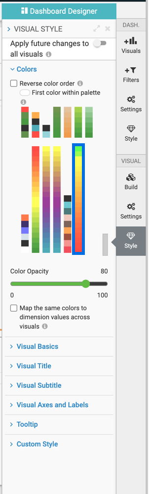 Administrators can create custom color palettes to provide additional styling options for visuals and applications. A custom color can be defined as a set of distinct colors or as a gradient, depending on the needs of the visualization. Once created, the custom color becomes available for all users to apply in their visuals.