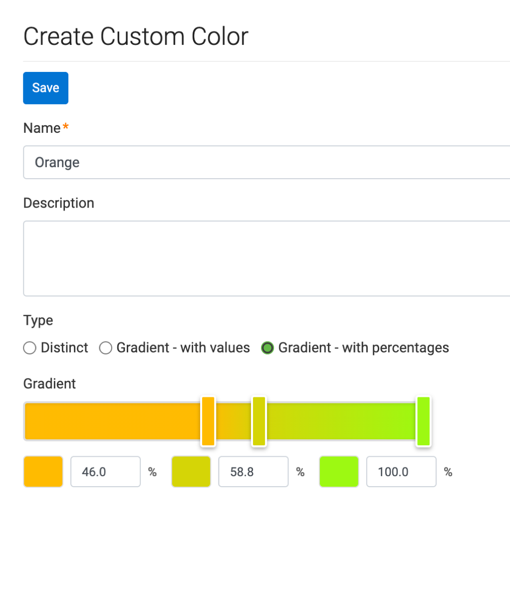 Users with an administrative role can create custom color palettes that use gradients with percentage-based color stops. These palettes are useful for visualizing value ranges and distributions.