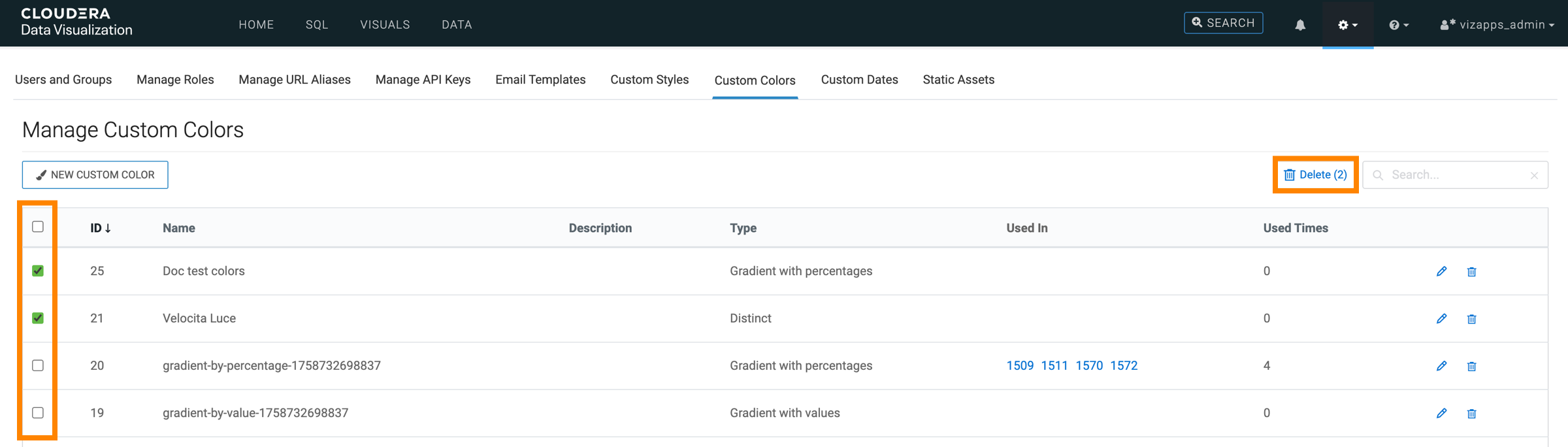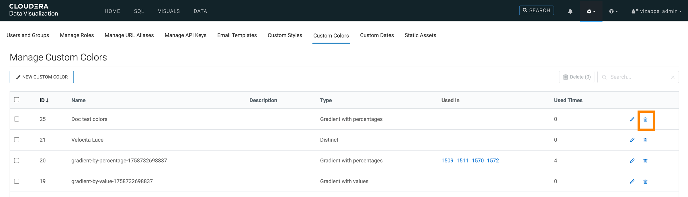 If a custom color palette is no longer needed, you can remove it Cloudera Data Visualization.