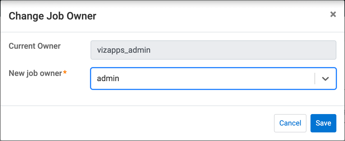 Cloudera Data Visualization enables job owners and system administrators to change the owner of an existing job. This functionality is particularly useful when reassigning jobs from deleted users, as these jobs cannot run until the owner is updated.