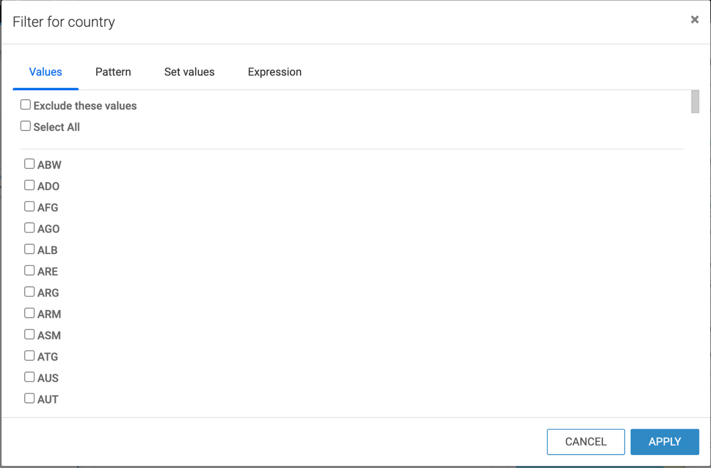 In this example, the country field is added to the filter shelf. A modal window pops up where you can set the values you want to filter for. You can choose discrete values, ranges, patterns, or use the Select All option for a bulk selection of the shown filter values.