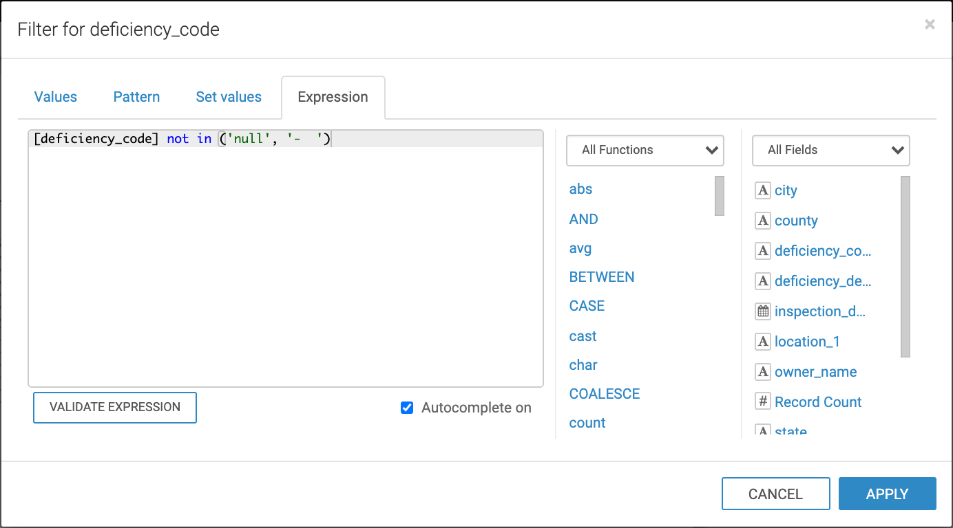 You can also create your own custom filter expressions by using the Expression tab. In this example, the deficiency_code field is added to the filter shelf with a custom filter expression.