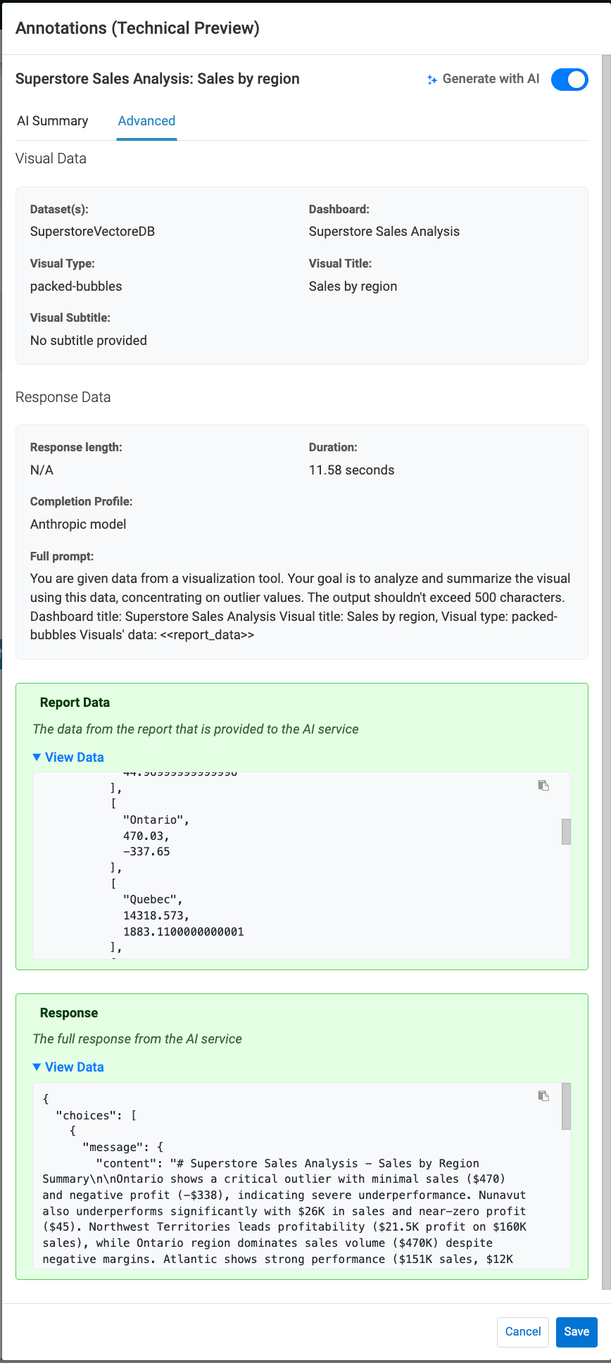 Switch to the Advanced tab to see the underlying details of the generation process, useful for validation or debugging.- Visual Data – Dataset, dashboard, and visual metadata