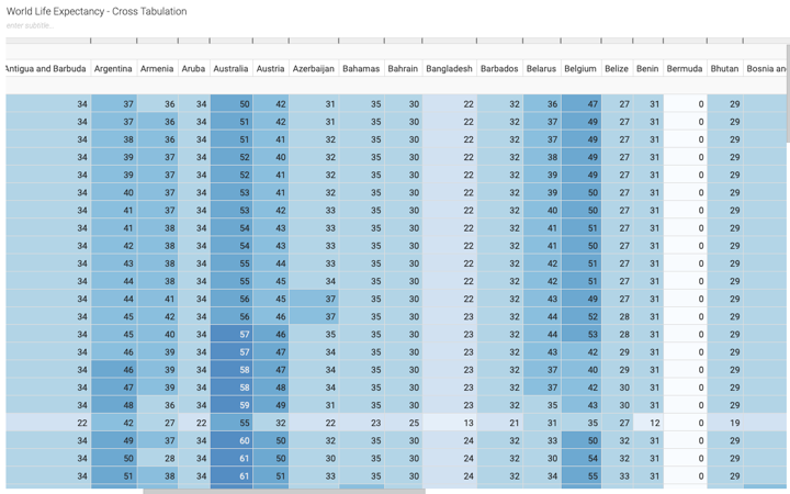 The updated Cross Tabulation visual appears. It shows life expectancy information for each row of the dataset. By default, Cross Tabulation visuals show smaller values in light colored cells, and larger values in darker colored cells.