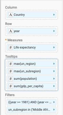 For example, drag the Dimensions 'un_region' and 'un_subregion', and the Measures 'population' and 'gdp_per_capita' to the Tooltips shelf.