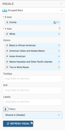 The following steps demonstrate how to create a Grouped Bars visual representation of ethnic distribution of population in some US counties. The example is based on the US Counties dataset. For more information, see Adding data and Creating a dataset.