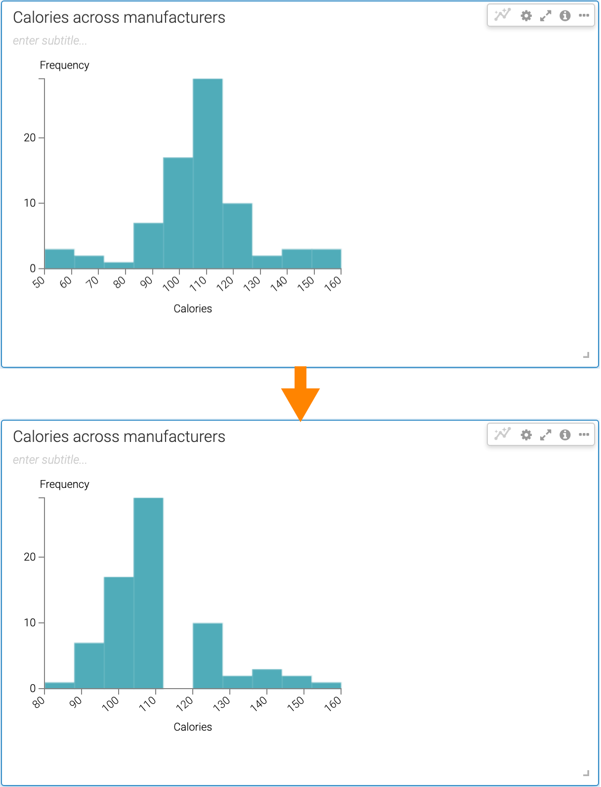 The following example shows a histogram with a wider range compared to a histogram with