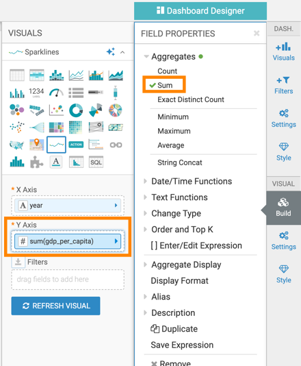 This is necessary because the Sparklines visual type uses aggregated measurements.The Y Axis shelf now contains the modified field