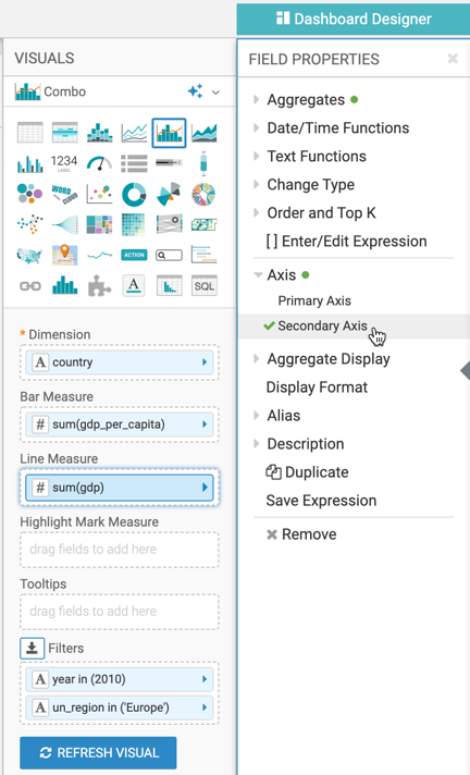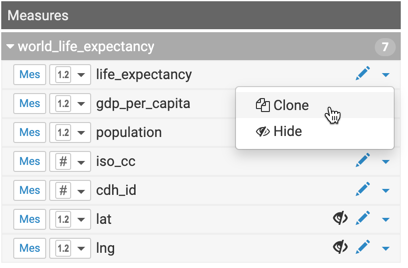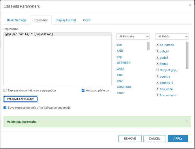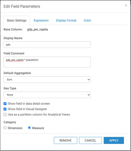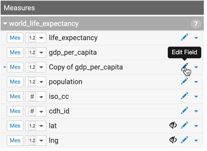 equation:gdp = gdp_per_capita x populationCloudera Data Visualization supports three primary methods of editing fields at the