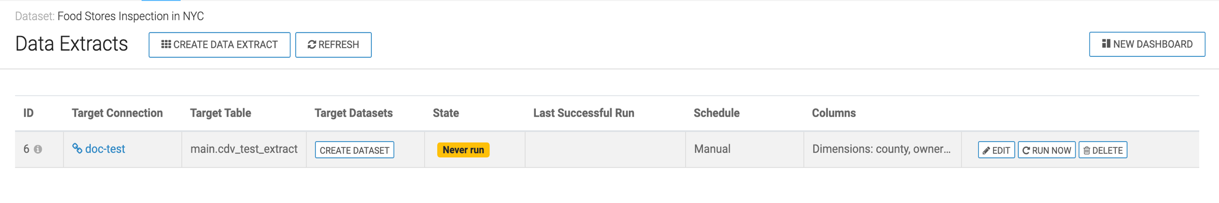 You must run the extract to populate the target table and allow building a dataset or dashboard on the target table.
