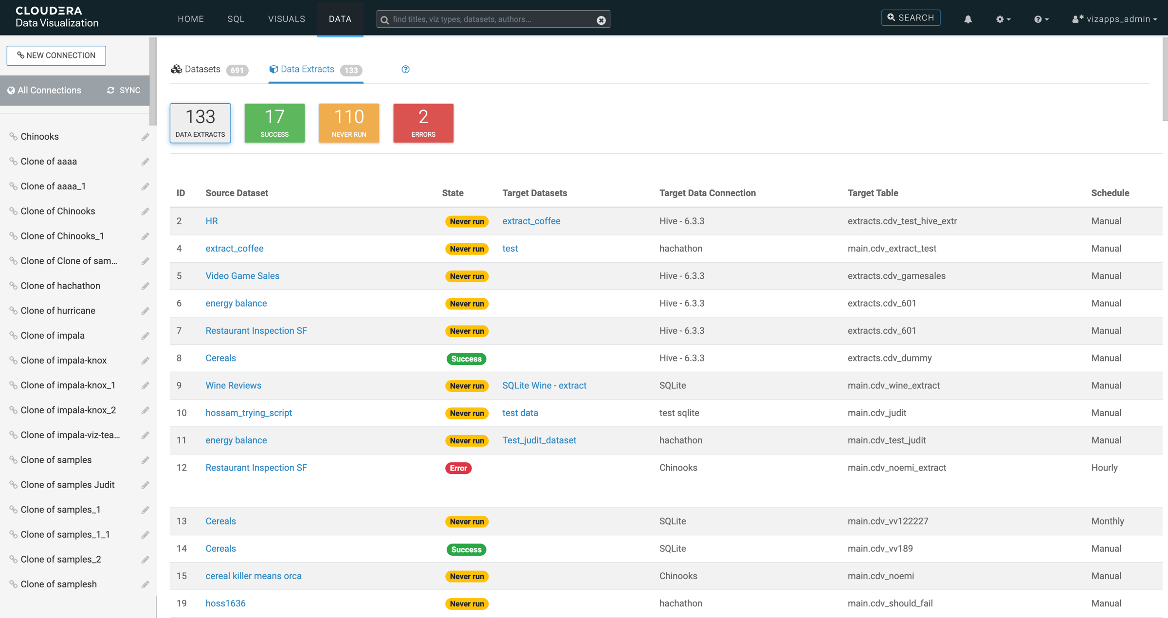Data Extracts view is displayed, showing all data extracts