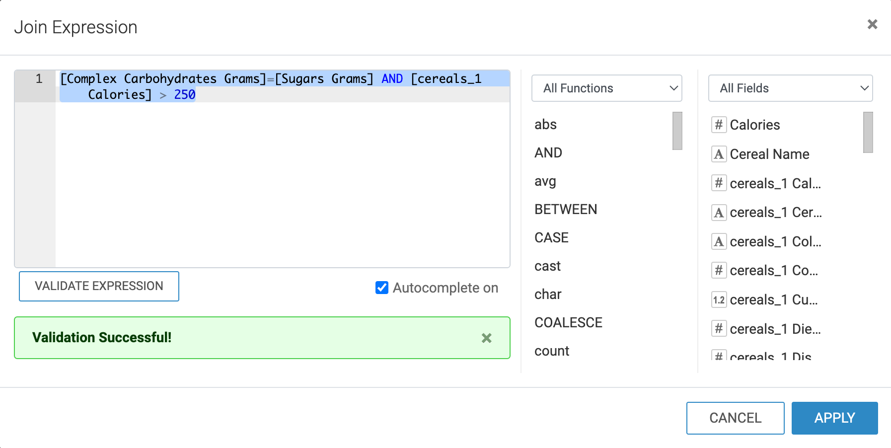 - Click APPLY to save the expression and return to the Edit Join modal window.