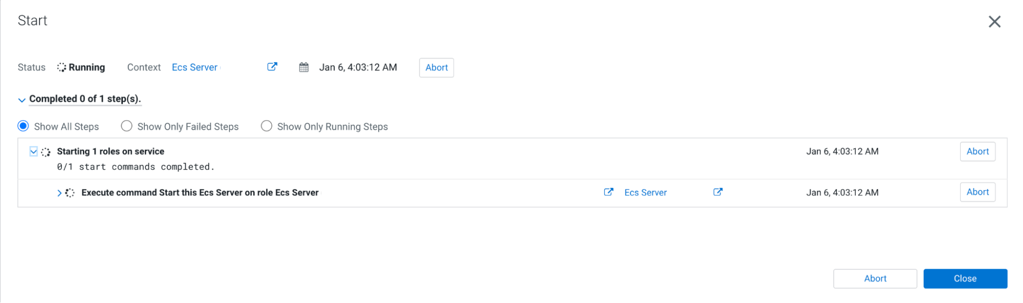 6. Start the new Cloudera Embedded Container Service server from Cloudera Embedded Container Service Instances view. For example, start Cloudera Embedded Container Service Server on agent1.