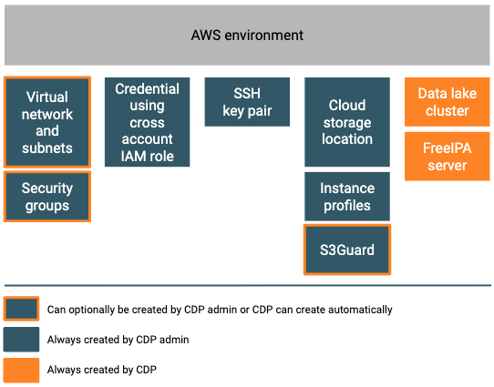 - Items in dark blue boxes with orange outlines can be automatically provisioned by Cloudera in your AWS account. Or you can optionally pre-create them in your AWS account and then provide them when registering an environment in Cloudera.