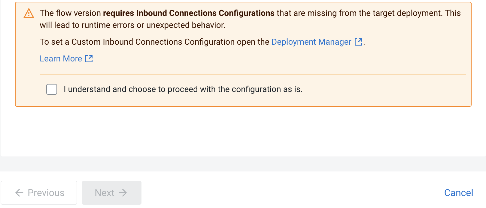 Depending on the flow you deploy, you may need to specify parameter values like connection strings or credentials, and upload files like truststores or JARs.